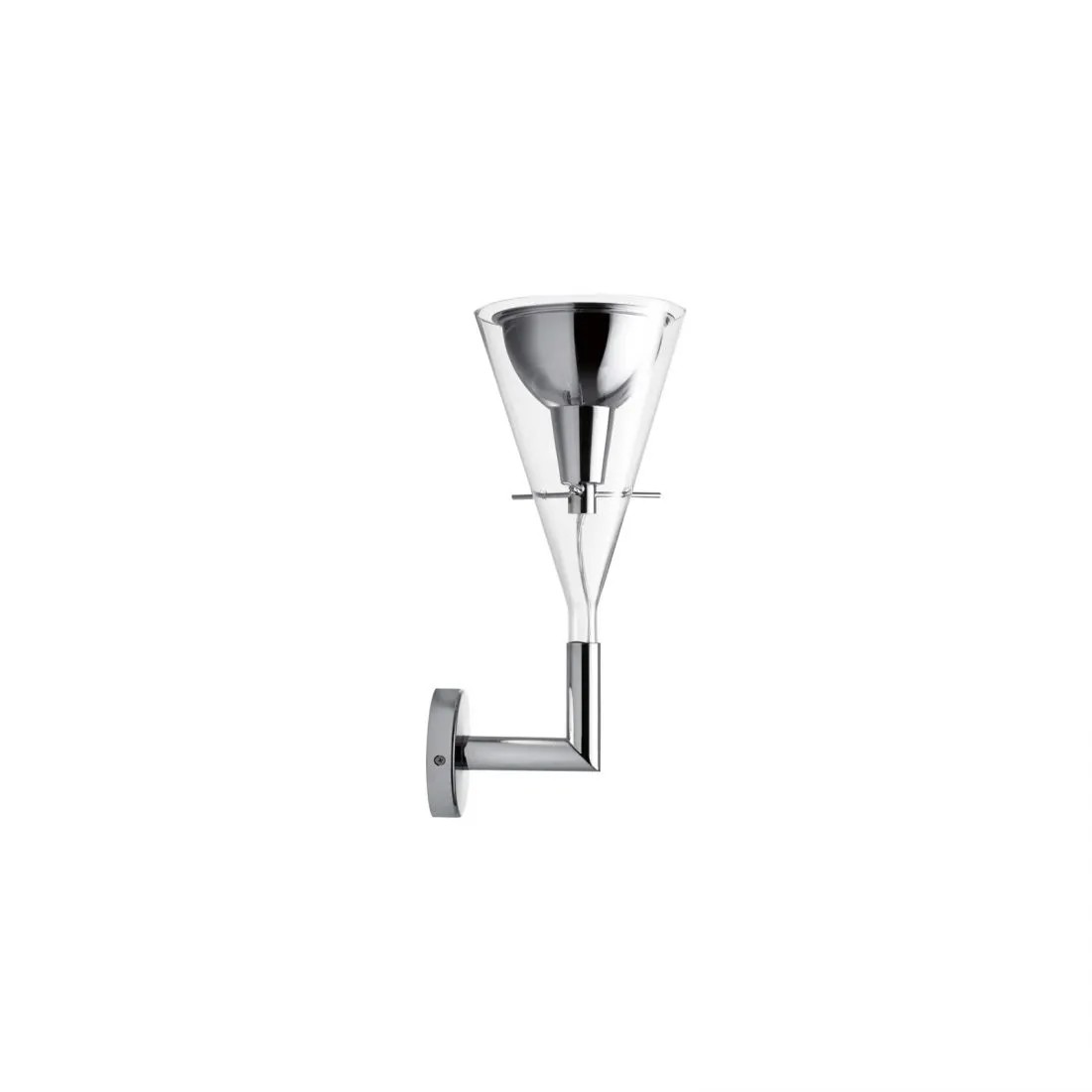 Un cono di vetro alloggia il riflettore in alluminio cromato, sorretto da tre aste sottili in metallo. Equilibrio e leggerezza per questa famiglia di lampade disponibili nella versione da terra e parete per una emissione di luce indiretta e a sospensione, per una emissione di luce puntuale e diretta.