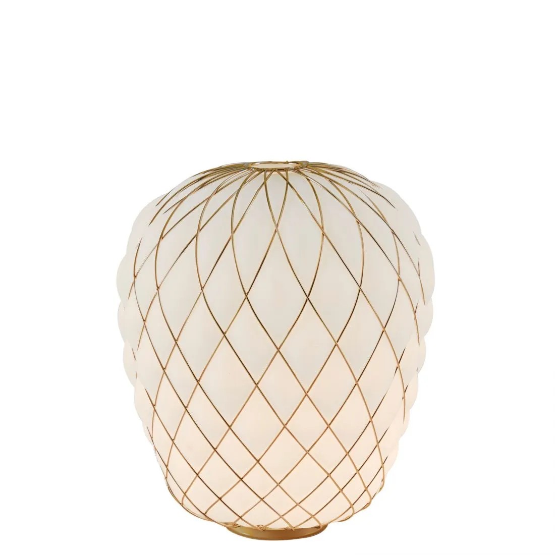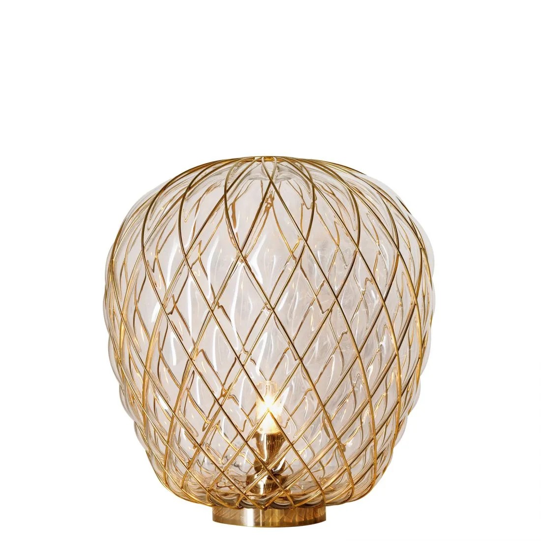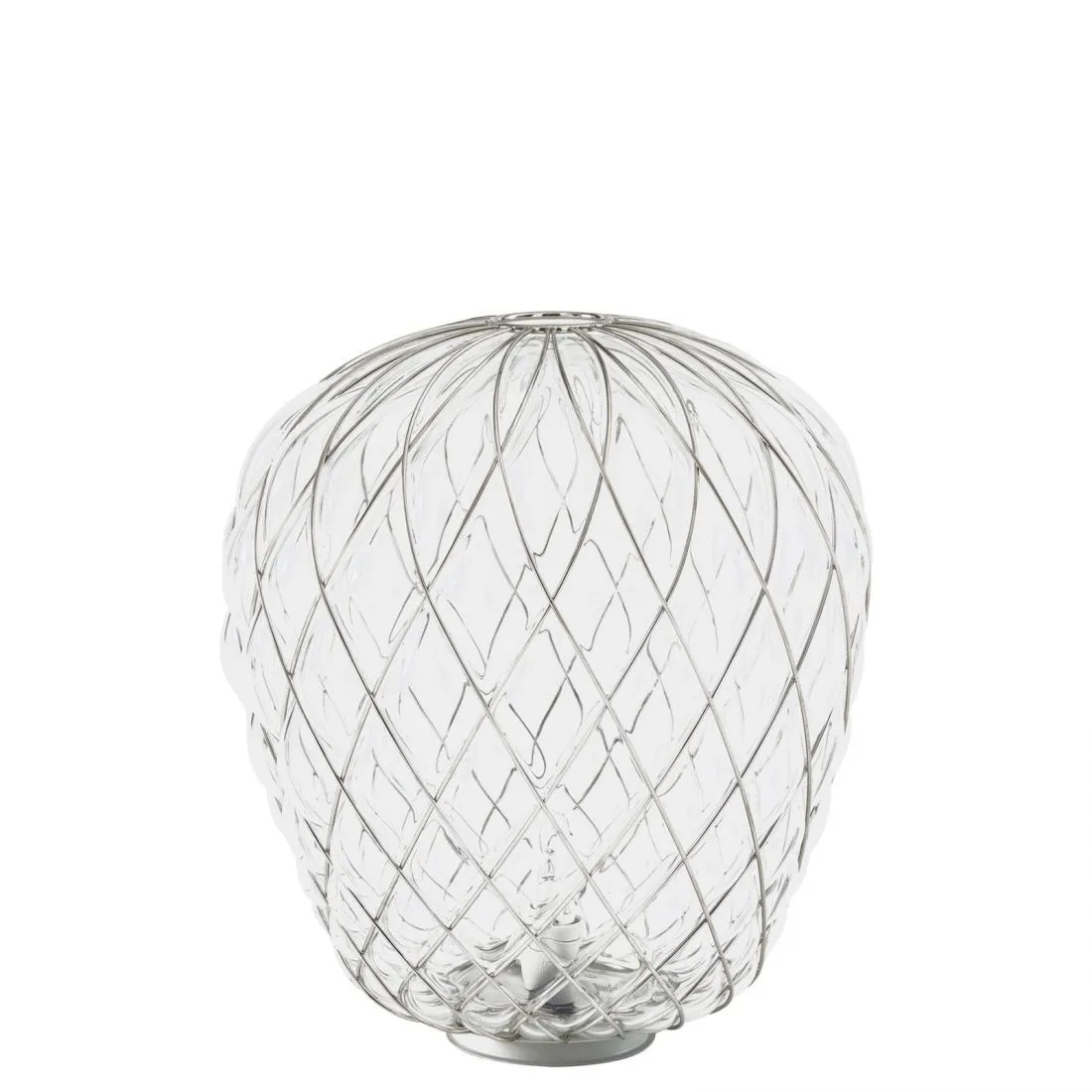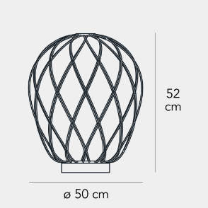 In questo modo il manufatto finale viene in parte trattenuto dalla gabbia e in parte vi sfugge, creando un gioco di tensione che genera un oggetto sospeso nell’atto di fuoriuscire dal proprio vincolo; la gabbia viene ulteriormente impreziosita da un trattamento galvanico che ne esalta l’aspetto rendendola lucida e brillante. La versione trasparente, in particolare, permette all’osservatore di leggere un doppio livello di struttura, moltiplicando l’effetto scenografico, e l’intreccio del cesto metallico proietta sulle superfici circostanti un caleidoscopico gioco d’ombre. Al contrario, la versione bianca segue delicatamente la gabbia e ne sottolinea le geometrie generando una luce diffusa elegante e piacevole. Si tratta di un apparecchio luminoso altamente suggestivo e di forte impatto sia da spento che da acceso.
