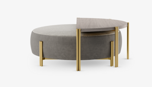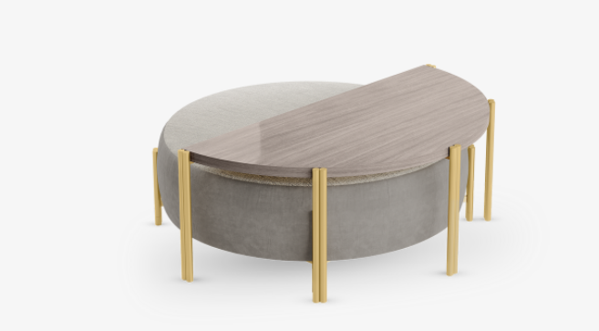 The RECIFE coffee table brings together two distinct pieces. A semi-circular coffee table in wood veneer overlaps a rounded upholstered stool, while pairs of metal tubular legs across both elements bring a sense of synchronisation to the whole.