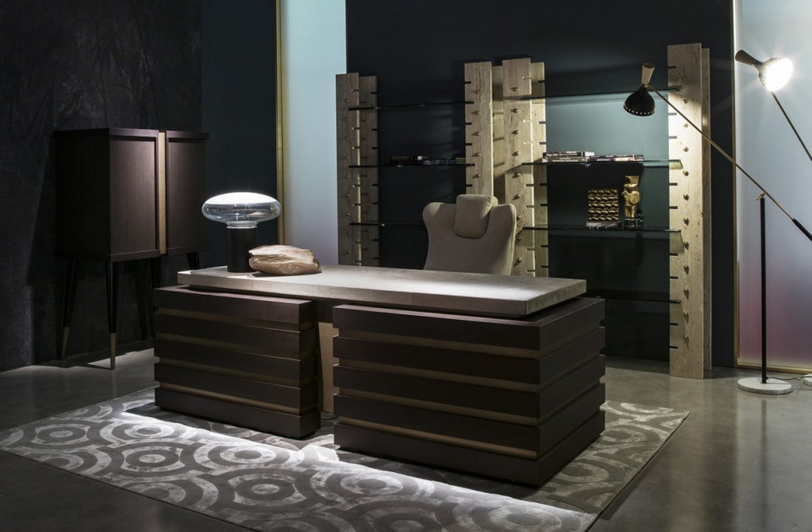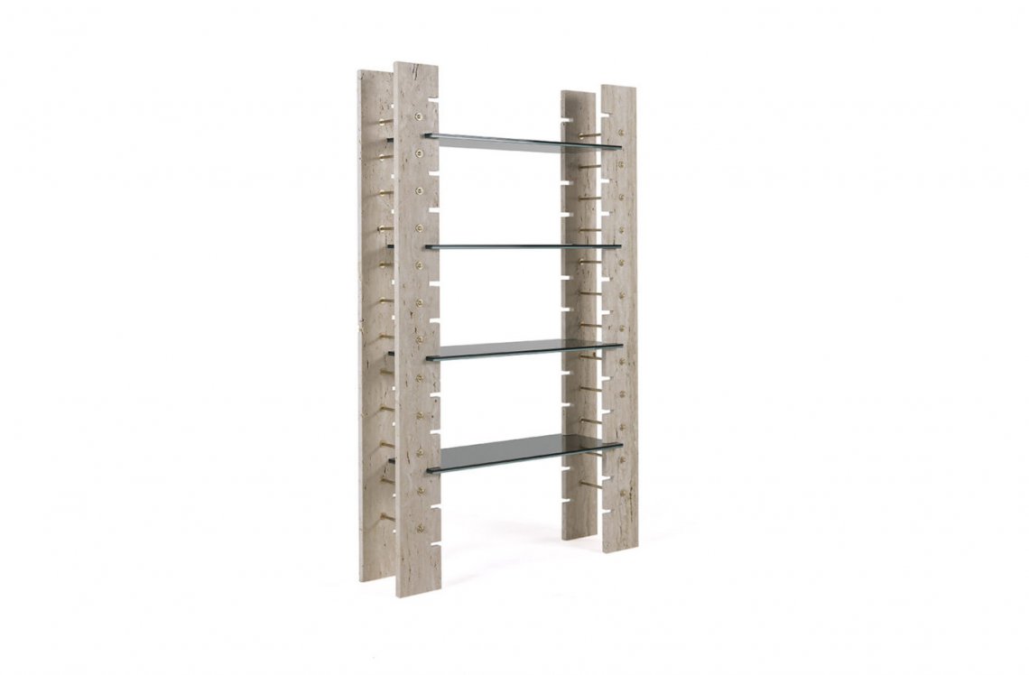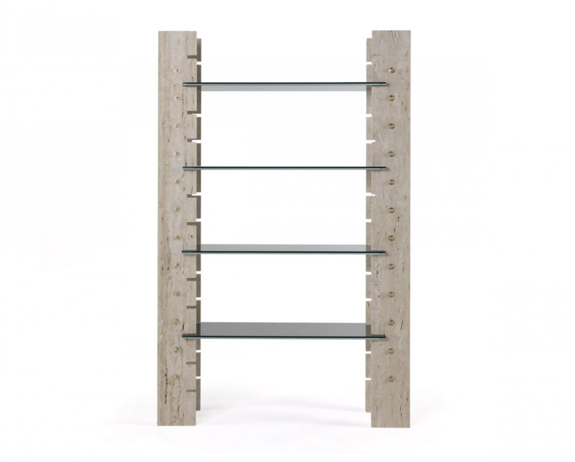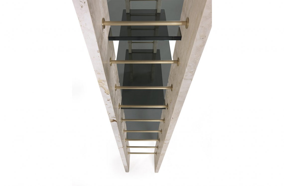 The Fitzroy line epitomises the industrial style which runs throughout the collection. These pieces, with a 1970s feel, are made of travertine marble, brass and smoked glass.