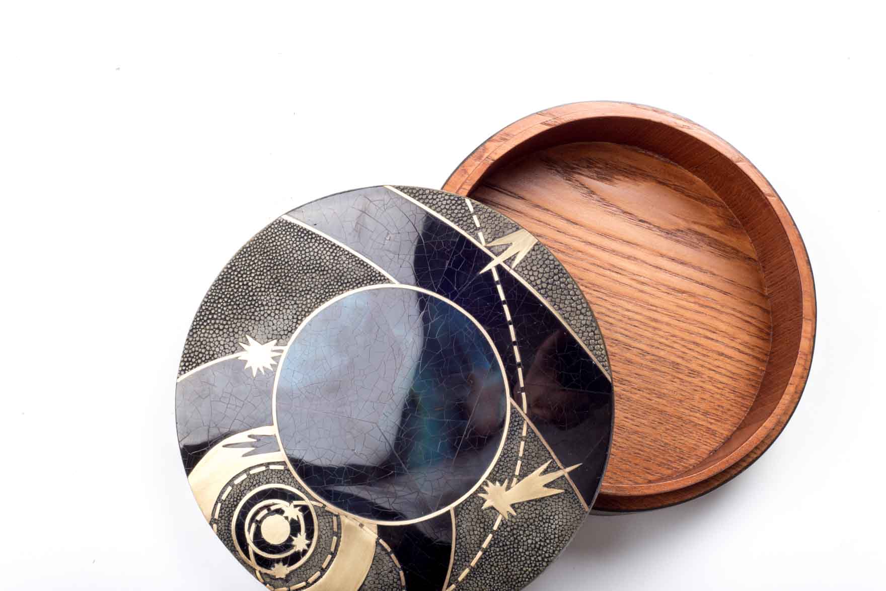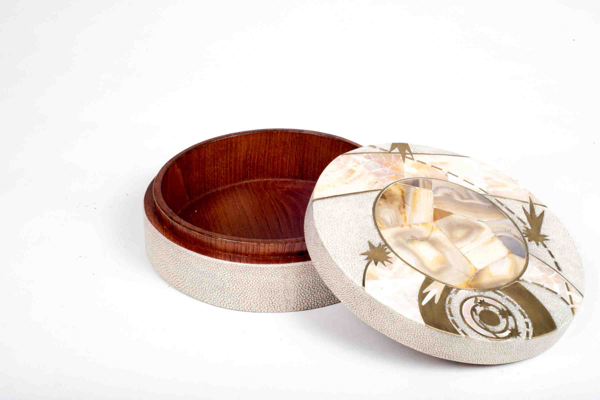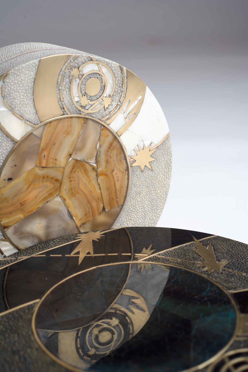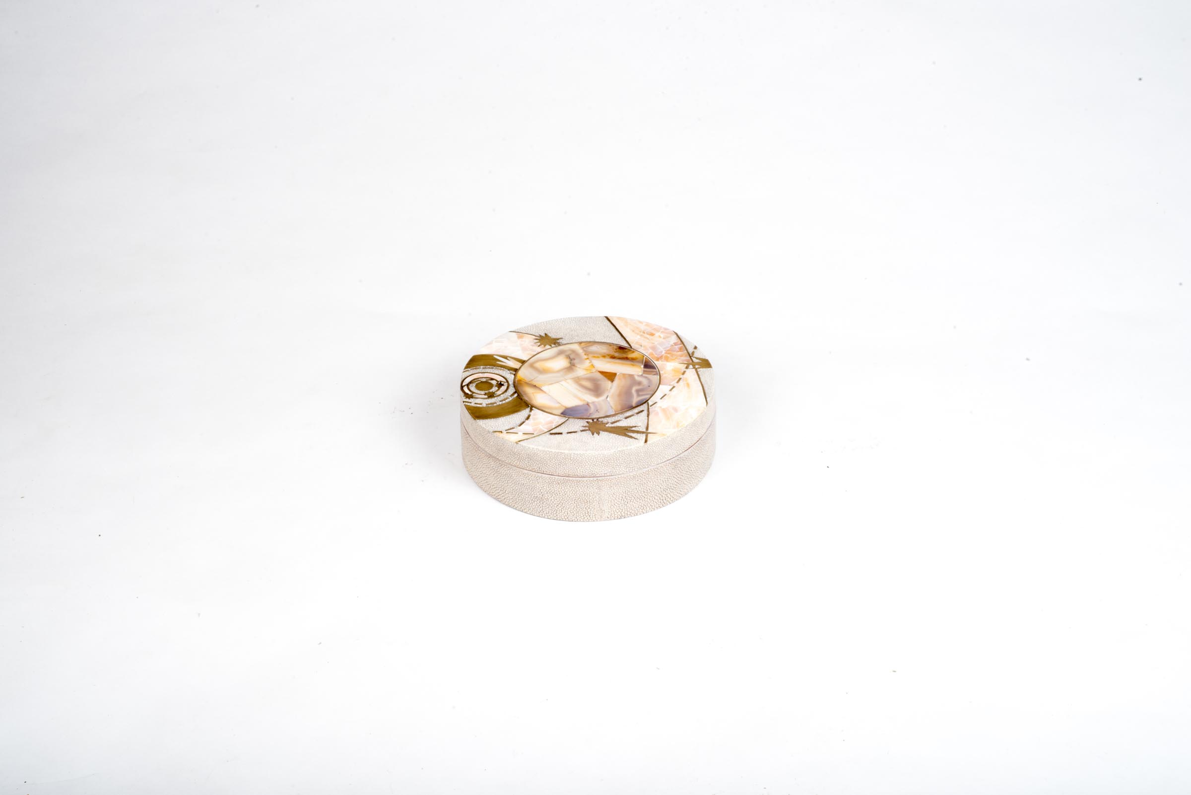 The Constellation Light Round Box showcases the signature whimsical details of KIFU PARIS. This piece includes intricate inlay work of shagreen, pen shell & bronze patina brass to create this stunning pattern. Available in other sizes and different finishes.