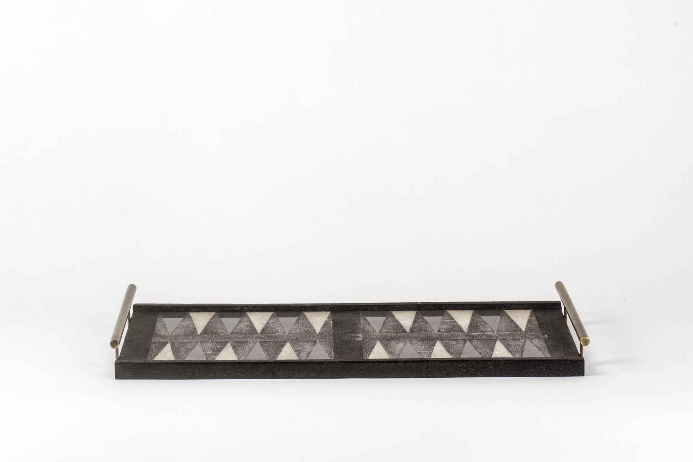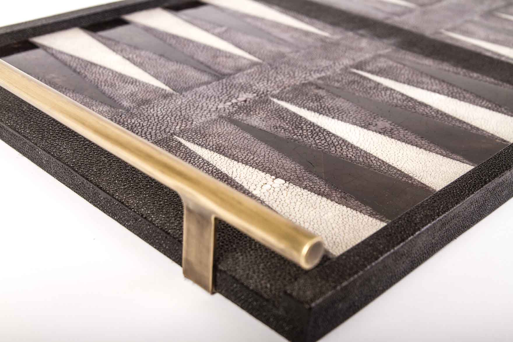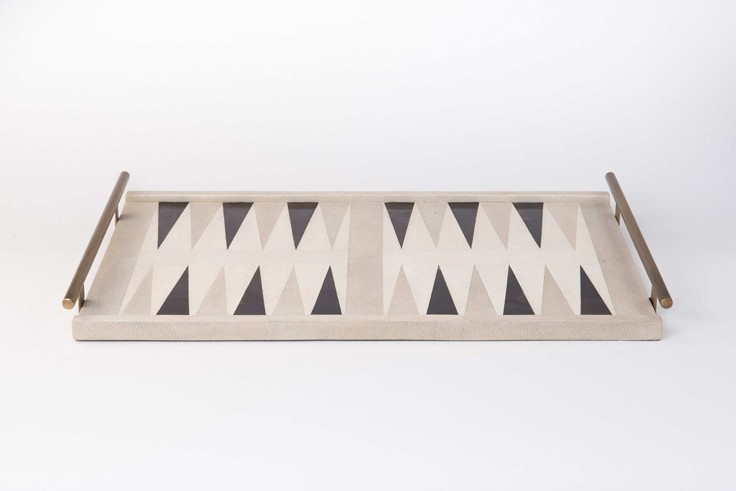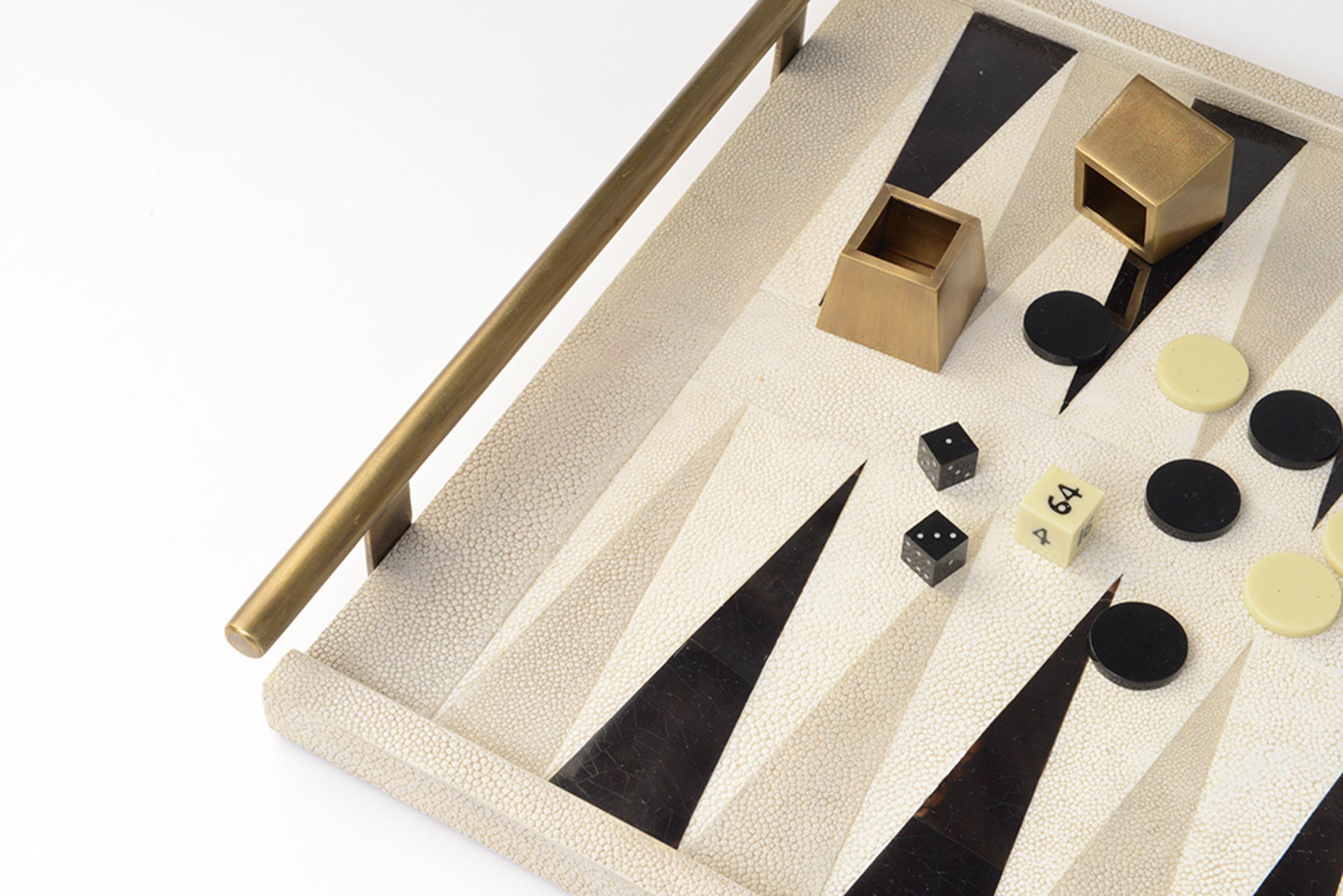 The KIFU PARIS Backgammon Game Tray is the ultimate luxury game. Accented with a mixture of shagreen, pen shell and bronze-patina brass this piece comes with all game parts in a velvet pouch. Available in a light or dark color way.