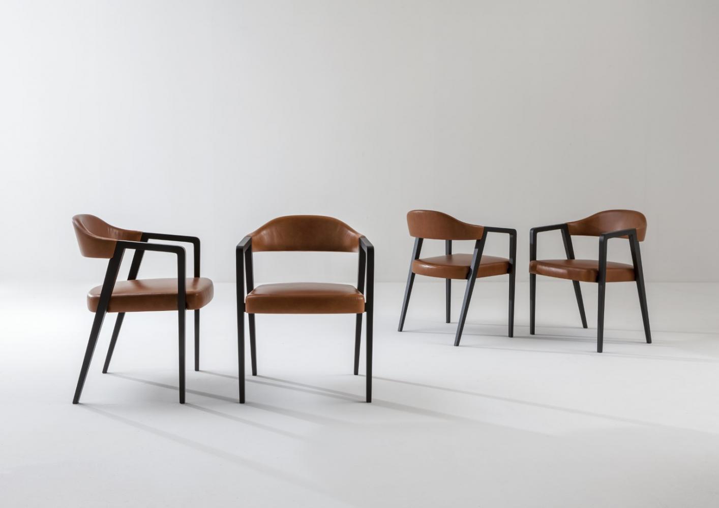 Chair with legs and armrests in plain, dyed or lacquered wood, and with seat and backrest upholstered in leather, velvet, or fabric.Legs adorned with vertical wood inlay.