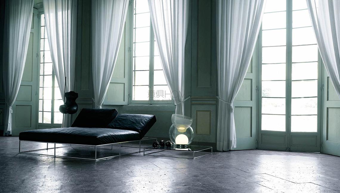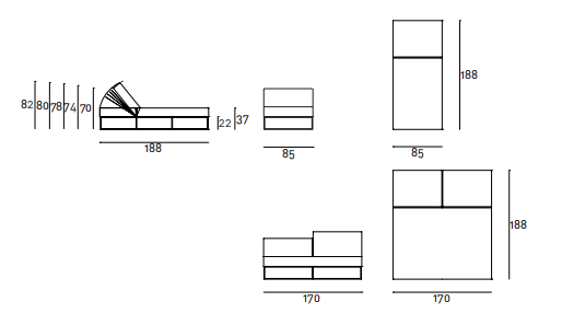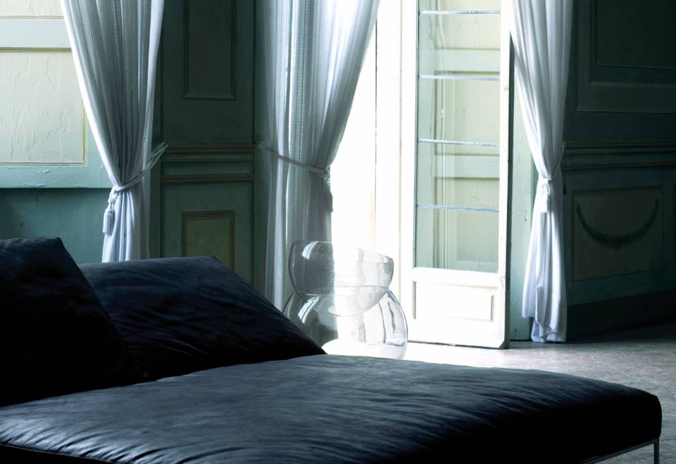 Daybed, single or double, available for indoor and outdoor. Indoor: seat chassis in lacquered steel with coated rubber elastic straps. Backrest in plywood panel adjustable through a mechanism. Seat and back cushions padded with differentiated density polyurethane foam and Visco-soft “Xtra-pur”, covered with a quilted mat in prewashed and sterilized goose down, stitched into separate compartments, or covered with acrylic fibre layers. AISI 304 stainless steel square section tube base, matt satin-finished. Fabric or leather upholstery, both fully removable by zippers and Velcro fastenings. Outdoor: seat chassis with cataphoresis treatment and lacquered for outdoor, coated rubber elastic straps, hooks in stainless steel for outdoor. Backrest in marine plywood panel adjustable through a mechanism. Seat and back cushions padded with open cell structure polyurethane foam DRYFEEL S, covered with a waterproof fabric. AISI 316 stainless steel square section tube base, matt satin-finish. Standard with wheels only in the single version 188x85cm. Upholstery with outdoor fabrics only, fully removable by zippers and Velcro fastenings. Both versions have a mechanism inserted into the backrest frame, adjustable in 5 different positions from daybed up to a height of 82cm. Seat depth 124cm.