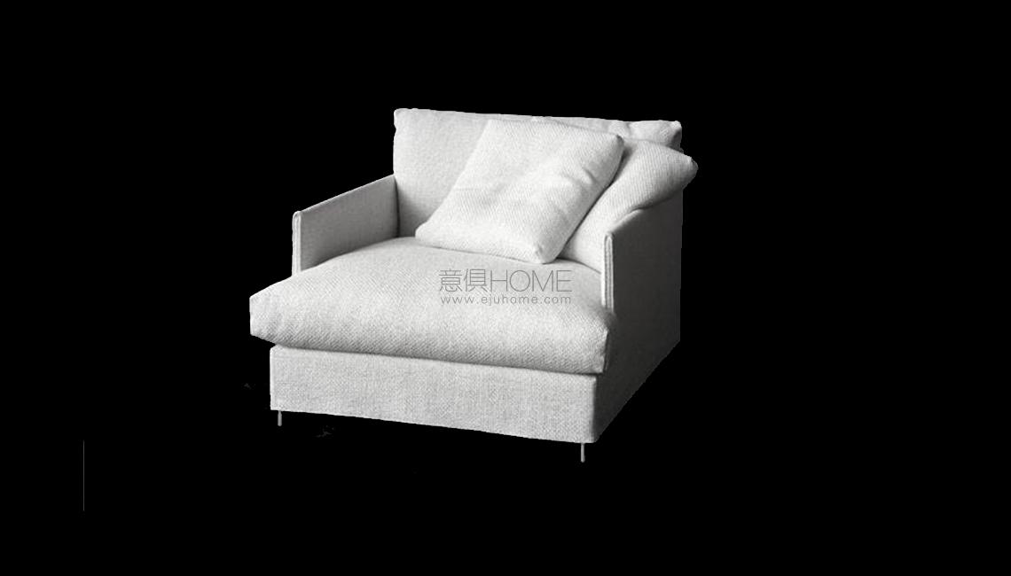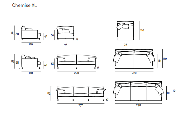 Fix or modular sofa and armchair. Supporting frame in lacquered  drawn tubular steel. Seat chassis in fir wood, with cross-woven,  coated rubber elastic straps. Backrest and armrest frames  made with a structural elastic material. Covering in 100%  polyether thermally bonded onto a polyamide velveteen backing.  Seat and backrest cushions padding with polyurethane foam insert  coated with prewashed and sterilized goose down, stitched into  separate compartments, or covered with acrylic fibre layers.  Armrest cushions and supporting pillows in prewashed and  sterilized goose down, stitched into separate compartments.  Tubular feet in AISI 304 stainless steel with matt satin-finish,  on request available in natural or ebony-dyed oak. Fabric or leather  upholstery, both fully removable by zippers and Velcro fastenings.  Standard flounce 7cm from the floor for fabric upholstery only,  on request available also without flounce.  The leather version is always without flounce. Seat depth 61-81cm.