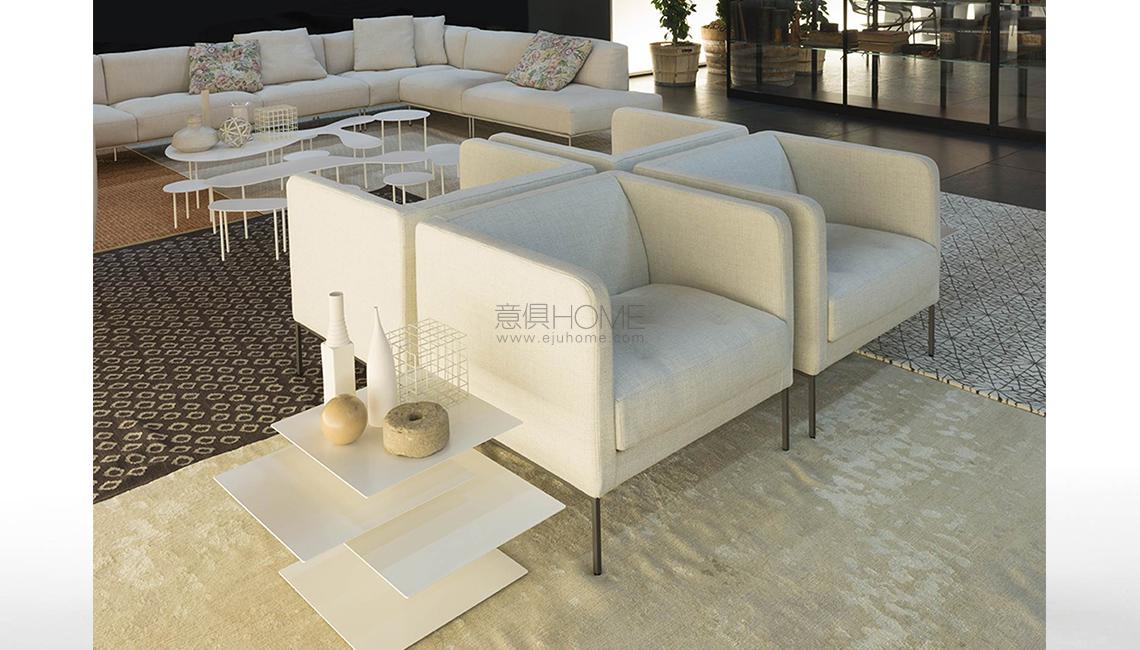 Armchair, fix or modular sofa with backrest and armrest frame in double-paneled fir-wood and padding in polyurethane foam and acrylic layers; seat chassis, in 40 x30 mm tubular steel with black epoxy powder coating and sprung with elastic straps, inset in the base structure in multilayer poplar wood padded in polyurethane foam covered in 100% polyether thermally bonded onto a polyamide velveteen backing. Backrest cushions, fixed to the structure through the coverings, in polyurethane foam and acrylic fibre layers. Quilted seat cushions, in prewashed and sterilized goose down, stitched into separate compartments, with differentiated density polyurethane foam insert. Tublar steel feet, joined by a bracket, in square section 15x15mm with bronzed epoxy powder coating and adjustable black PVC tips. Fabric or leather upholstery, with sewn stitching on seat cushion only, both fully removable by zippers and Velcro fastenings. Seat depth: armchair 53 cm; Easy Lipp 65cm; Easy Lipp XL 85 cm.