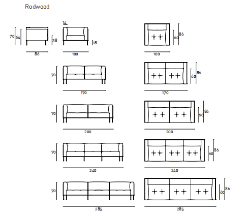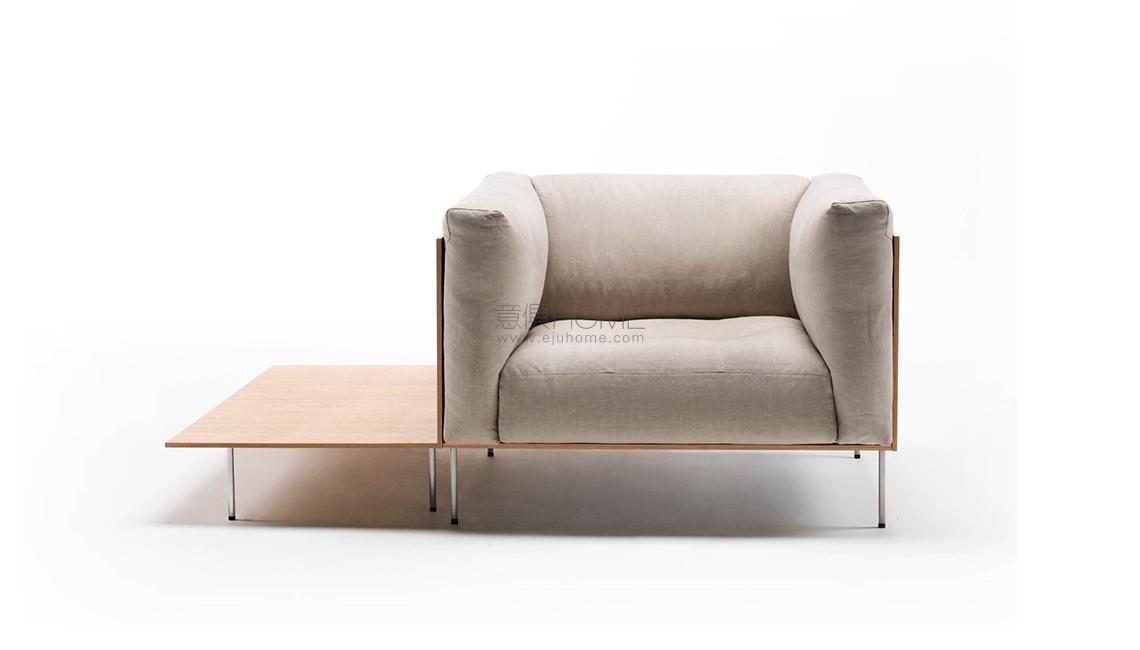 Sofa and armchair. Supporting structure in lacquered drawn  tubular steel, seat sprung with coated rubber elastic straps.  Backrest and armrest structure in 10mm HPL panel, veneered  with heat-treated oak plates with water-based acrylic paint  finish. Back and seat cushions in prewashed and sterilized  goose down, with polyurethane foam insert. The seat cushions  are quilted with buttons at sight or, on request, quilted without  buttons. Armrest cushions in polyurethane foam covered  with prewashed and sterilized goose down, with a poplar  plywood supporting panel fixed to the frame by plug-in hinges.  Stainless steel feet, polished or matt-satin finish, screwed to  the base with a bushing. Fabric or leather upholstery, both fully  removable by zippers and Velcro fastenings.  Seat depth 60-80cm.