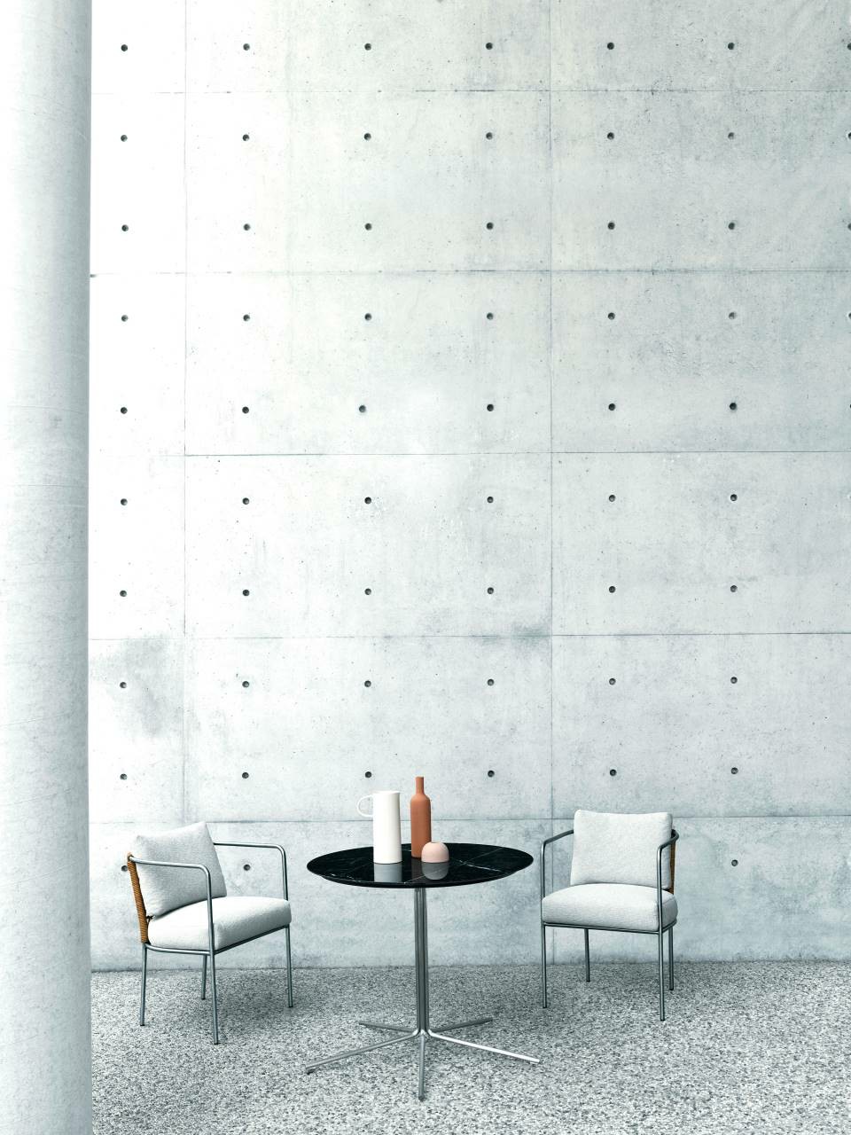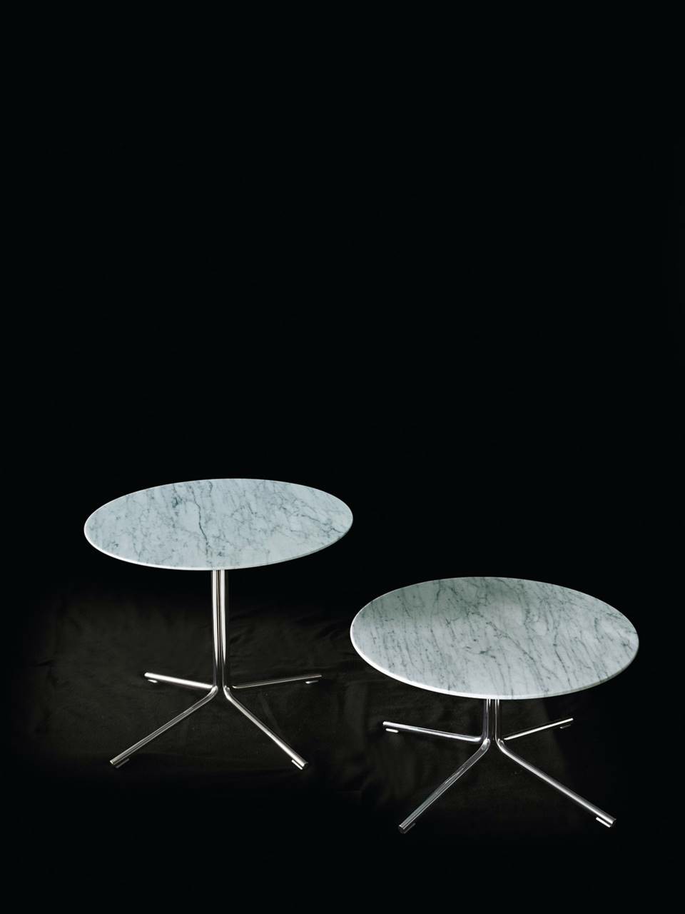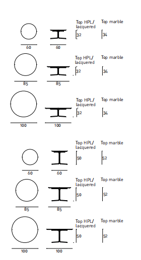 Table in different heights and sizes, available for indoor and outdoor. Indoor: 4 legs base in chromed-plated steel or AISI 316 stainless steel with matt satin-finish. Top in decorative multilayer HPL, decorated on both sides, white or black colours; in MDF white or black lacquered; in white Carrara marble, black Marquinia marble or Slate stone. Outdoor: 4 legs base in AISI 316 stainless steel with matt satin-finish. Top in decorative multi-layer HPL decorated on both sides, white or black, or Slate stone. In both versions, the base for tops ?85cm or 100cm with 72/74cm height has 5 legs.