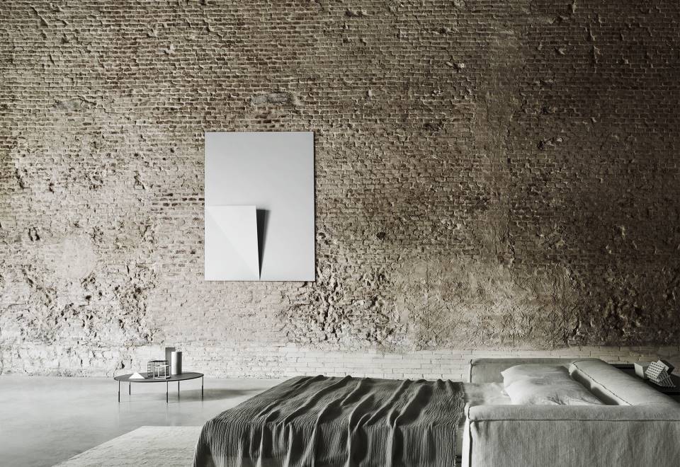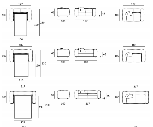 Sofa bed with frame in double-panelled poplar and pine. Padding in differentiated density polyurethane foam. Covering in needle punched, resinated, nonwoven polyester fibre, bonded onto a polyamide velveteen backing. Seat cushion padded with differentiated density polyurethane foam structure, covered with acrylic fibre layers. Black lacquered steel feet. Fabric or leather upholstery. The fabric version only is fully removable by Velcro fastenings. Electro-welded orthopedic base, high tensile steel frame with stove epoxy powder coating finish. Steel spring mattress with 100% cotton cover. Seat depth 74cm.