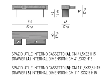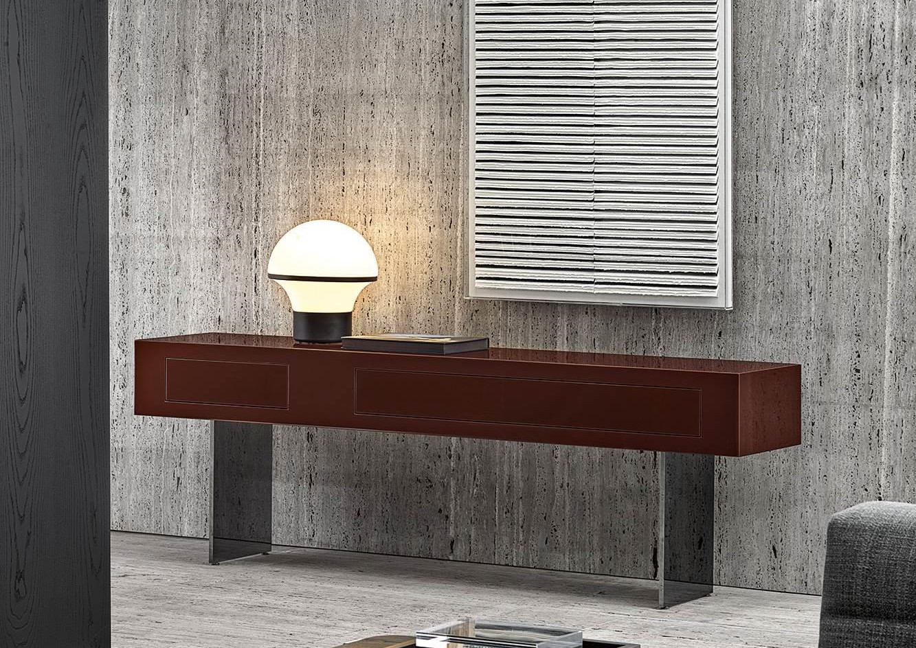 They range from the parallelepiped volume, which is tall enough to be set alongside a dining table as an additional seat, to coffee tables for holding or storing objects, and nightstand for the sleeping area. The rich ensemble is completed by the console table, which sits on metal blade-like legs with a Black-Nickel finish.