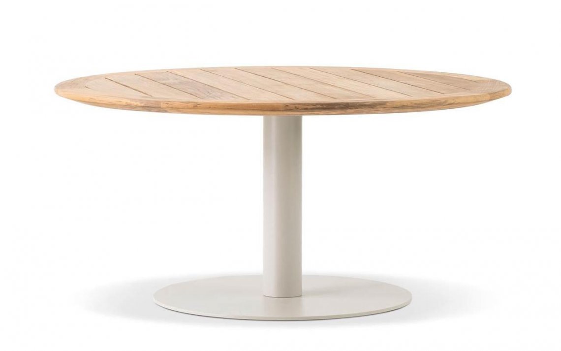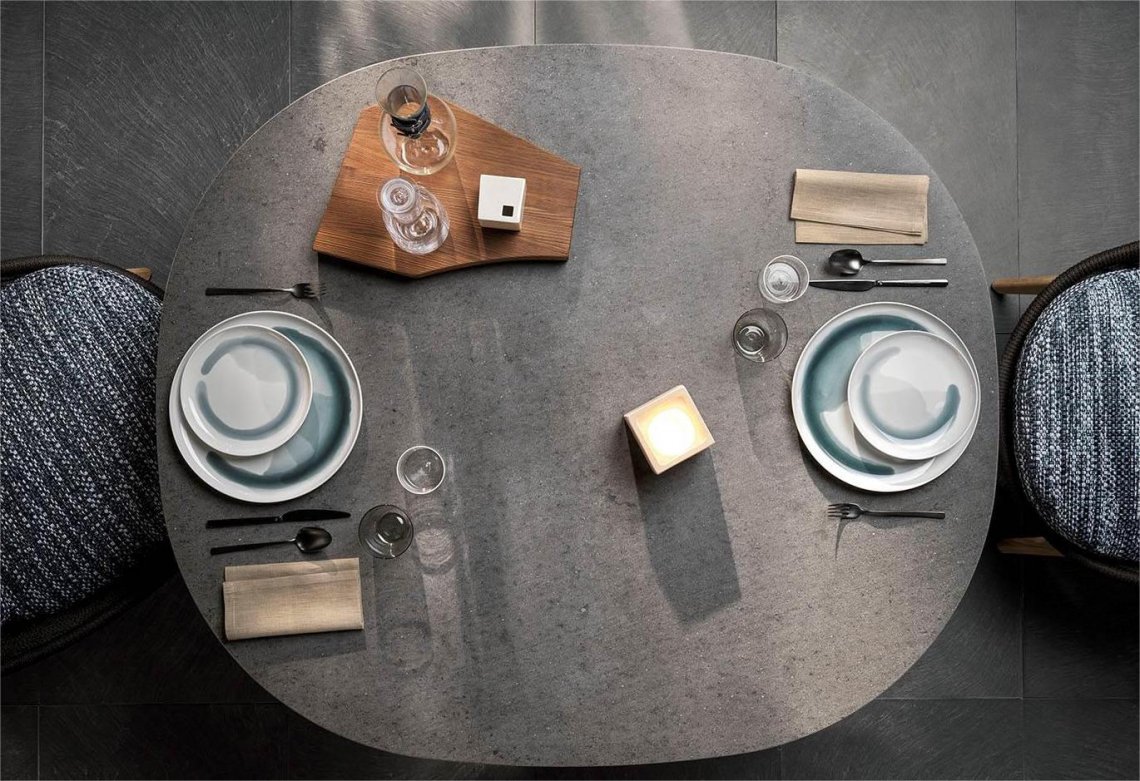 The contoured and fine-grain polished Basaltine stone version undergoes a unique stain-resistant treatment and has a stainless steel base with a polished Pewter, matt Ecru or matt Dark Brown epoxy paint varnish that guarantees colour stability over time. The variant with a teak top in a natural finish has a structural stainless steel frame, varnished matt Ecru or Dark Brown colour to match the finish of the base.