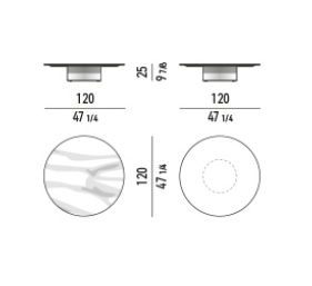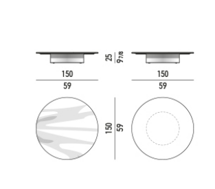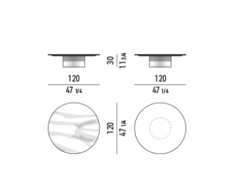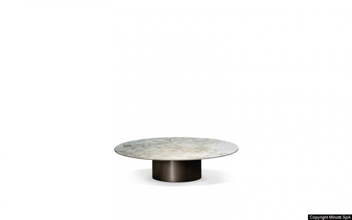 Doyle is available in three different sizes, with 120 cm diameter and 25 or 30 cm height or 150 cm diameter and 25 cm height, and has a cylindrical base covered in varnished polished Bronze metal.