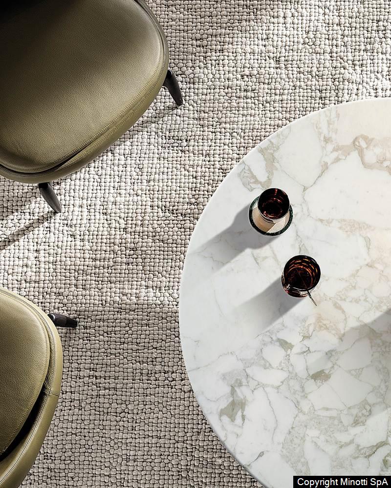 Inspired by Mid Century lounge atmospheres, the Doyle coffee table consists of a 20 mm thick circular top in Calacatta marble or Belvedere granite with brushed finish, both with rounded edge.