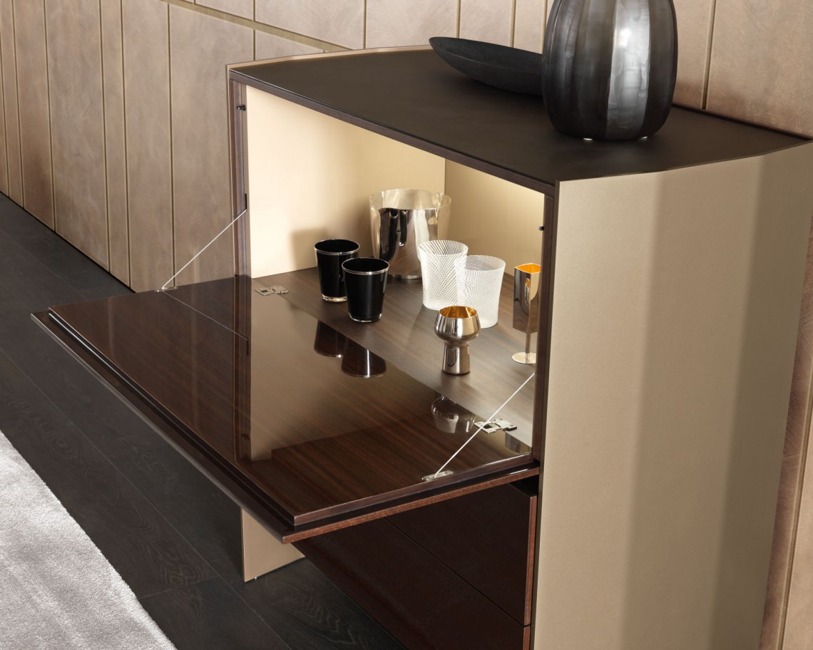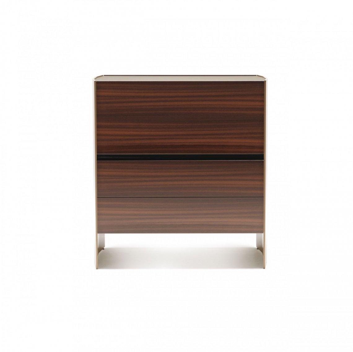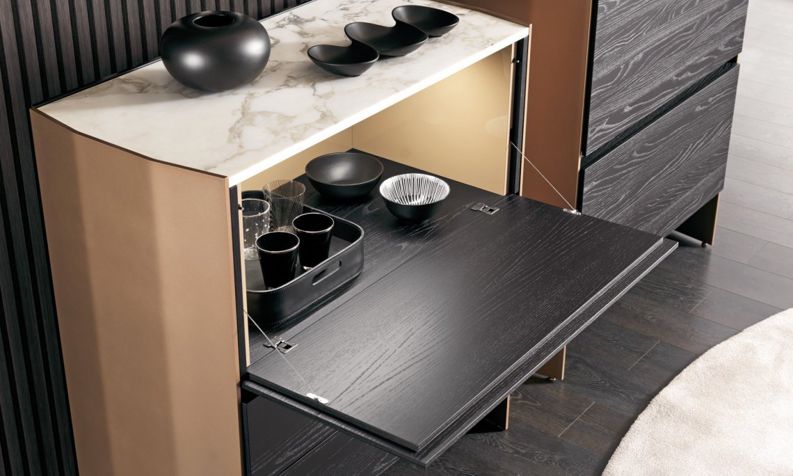 槍灰色或者青銅色的鋁合金框架側(cè)板,與胡桃木,灰榆木,白蠟?zāi)?,煙熏橡木或黑橡木,加上珍貴的實(shí)木,漆面或大理石等材質(zhì)構(gòu)成多種抽屜選擇。再配有原色或者煙熏色玻璃層架,和通常以實(shí)木或理石臺(tái)面材質(zhì)的抽屜柜完美匹配,賦予一種本真的意味。