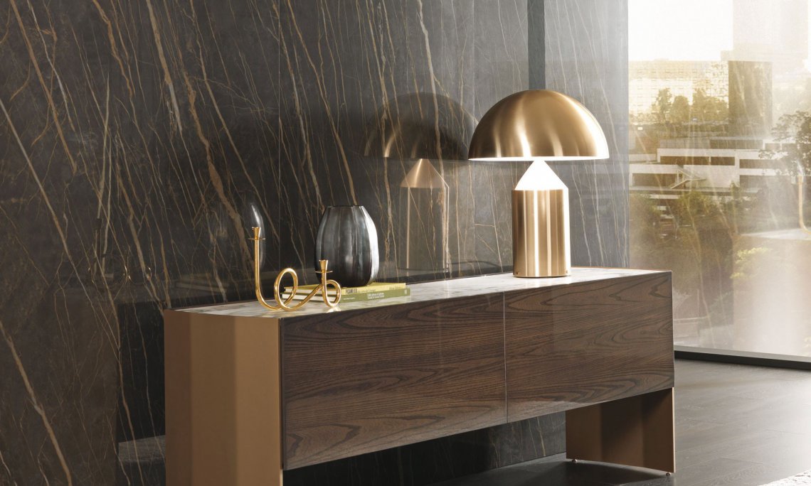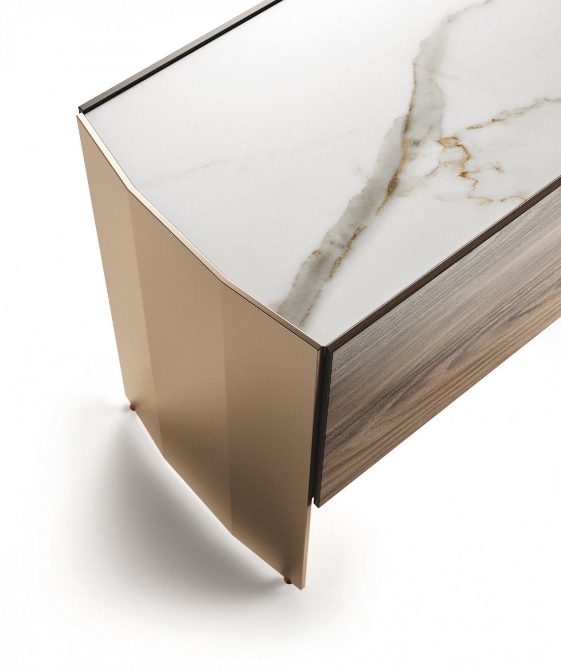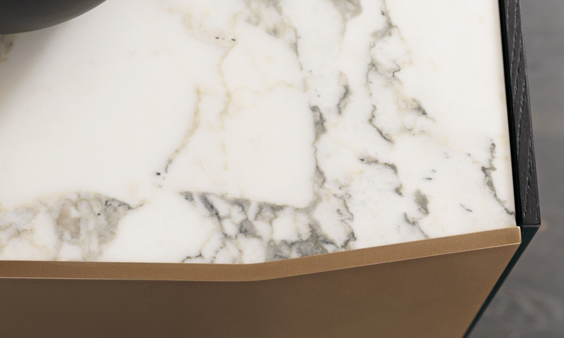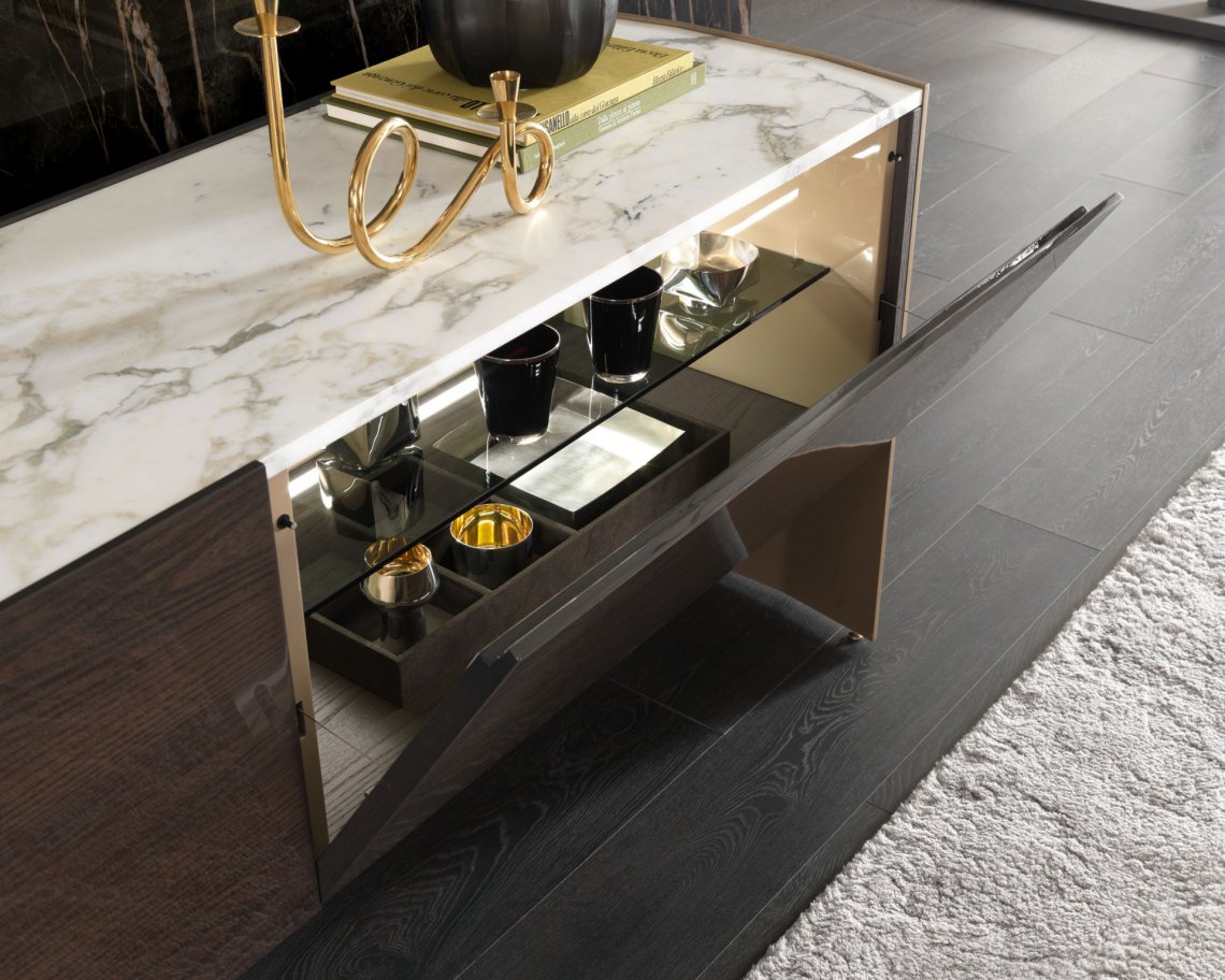槍灰色或者青銅色的鋁合金框架側(cè)板,與胡桃木,灰榆木,白蠟?zāi)?,煙熏橡木或黑橡木,加上珍貴的實(shí)木,漆面或大理石等材質(zhì)構(gòu)成多種抽屜選擇。再配有原色或者煙熏色玻璃層架,和通常以實(shí)木或理石臺(tái)面材質(zhì)的抽屜柜完美匹配,賦予一種本真的意味。