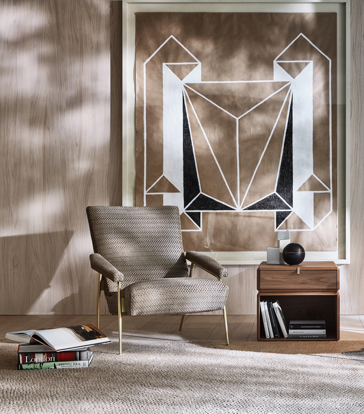 單一或組合元件疊加成各類元素,讓其在組織線 性或 非線性居住空間的床頭柜、抽屜柜或45°大理石基面玻璃茶幾時更顯活力。
