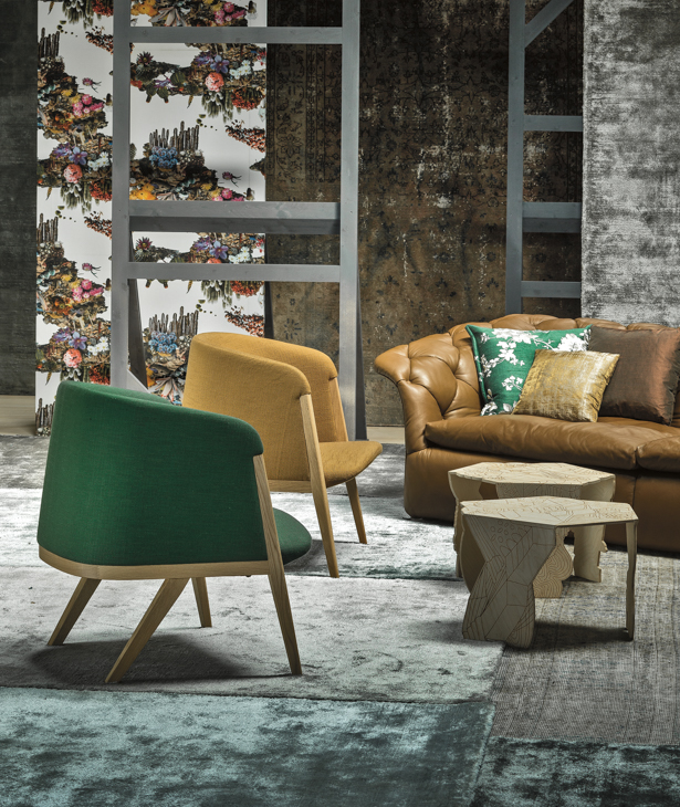 Poliuretano espanso ignifugo a densità differenziate e fibra poliestere con struttura interna in legno. Base in lamiera di acciaio tagliata al laser, sagomata e verniciata a polveri. La collezione Modernista non è sfoderabile.