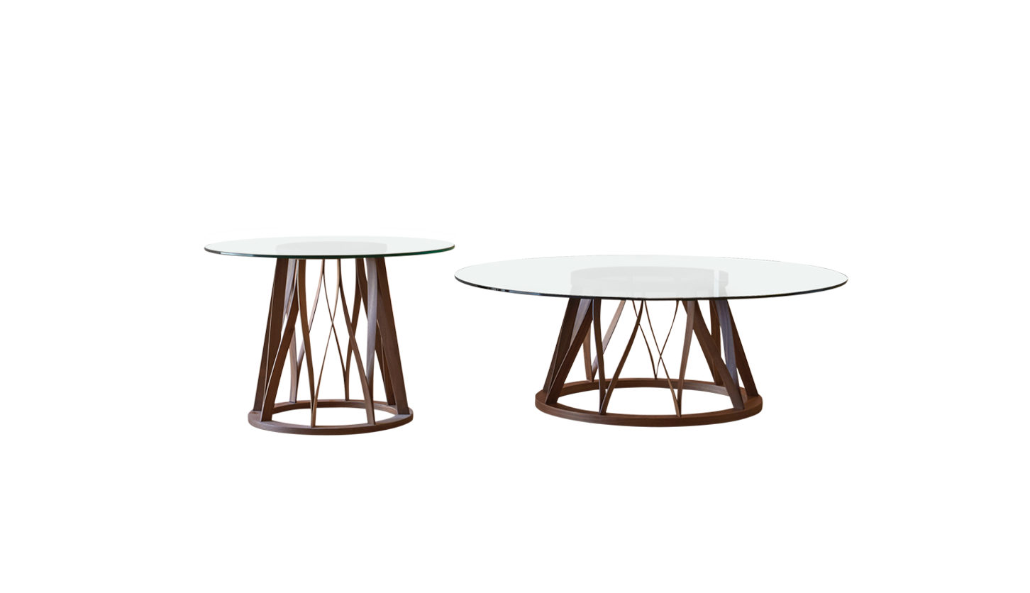 Coffee table version of the dining table of the same name. The glass top gives the environment a bourgeois touch, which is enriched by the sinuous lines of the wooden base.