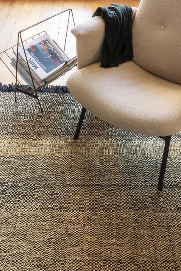 The beauty of this collection, hand-woven in India, lies in its glow, which is achieved thanks to the use of golden Tencel fiber, combined with the elegance of the black wool. In addition, the crossing of the fibers and their different thicknesses generates a cushioned texture, very pleasant to the touch.