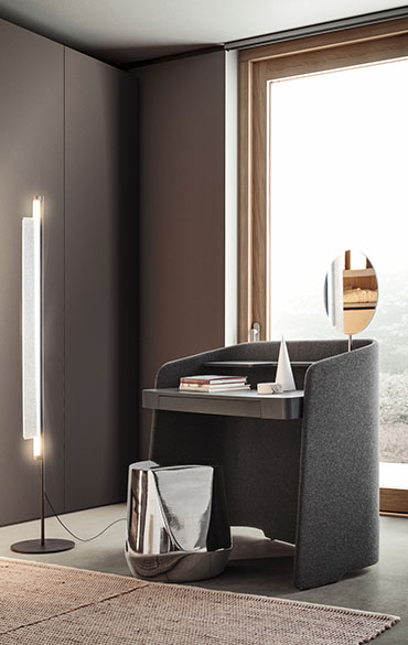 Haik presents itself as a harmonious blend of geometric shapes, able to reflect and play with the light of its beautiful metallic finishes, but also to fit with determination in areas essential in white color version.