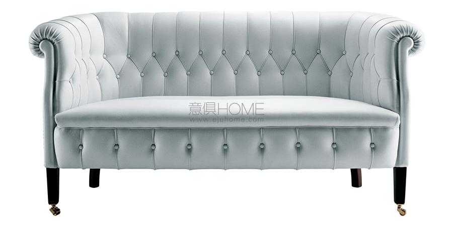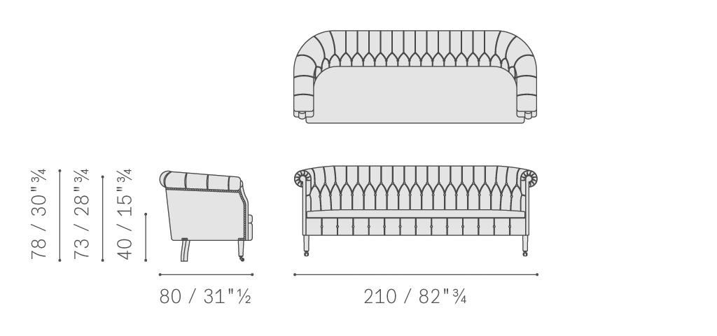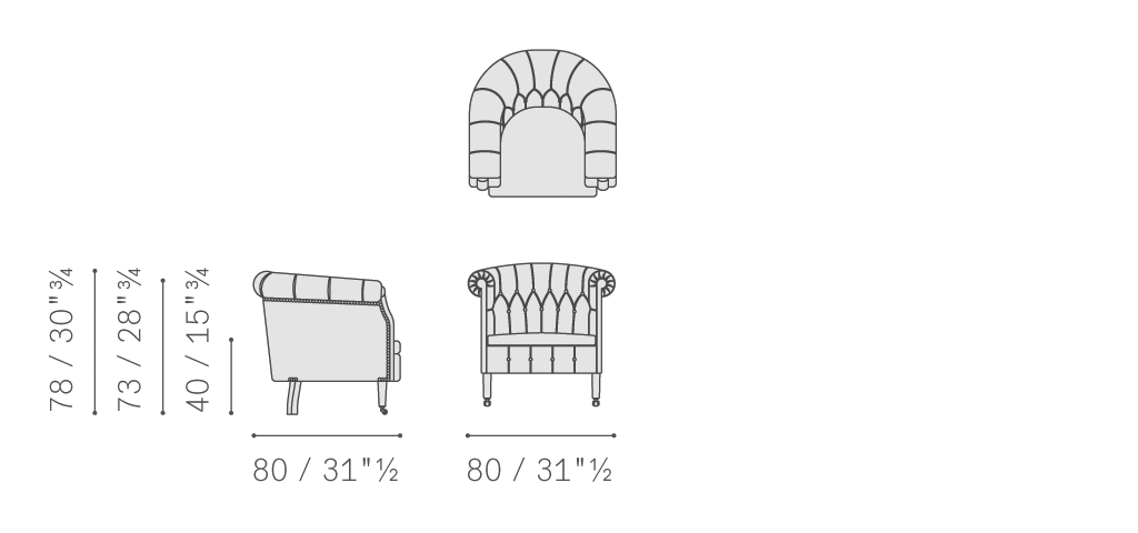 Fumoir整個系列均配備黃銅前輪,靠背采用菱形縫線,并使用軟皮面扣子。扶手椅和沙發(fā)后側(cè)和側(cè)面以一排包覆軟皮的釘子裝飾。支撐結(jié)構(gòu)采用陳年櫸木。座椅彈簧采用手編鋼制雙錐形彈簧,架在黃麻帶上。包墊填充涂膠馬鬃。表面覆蓋Pelle Frau?軟皮或布藝。