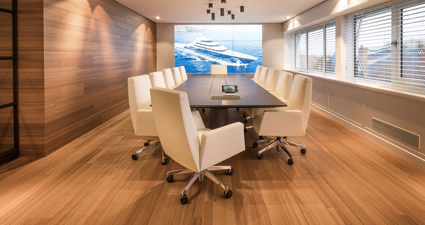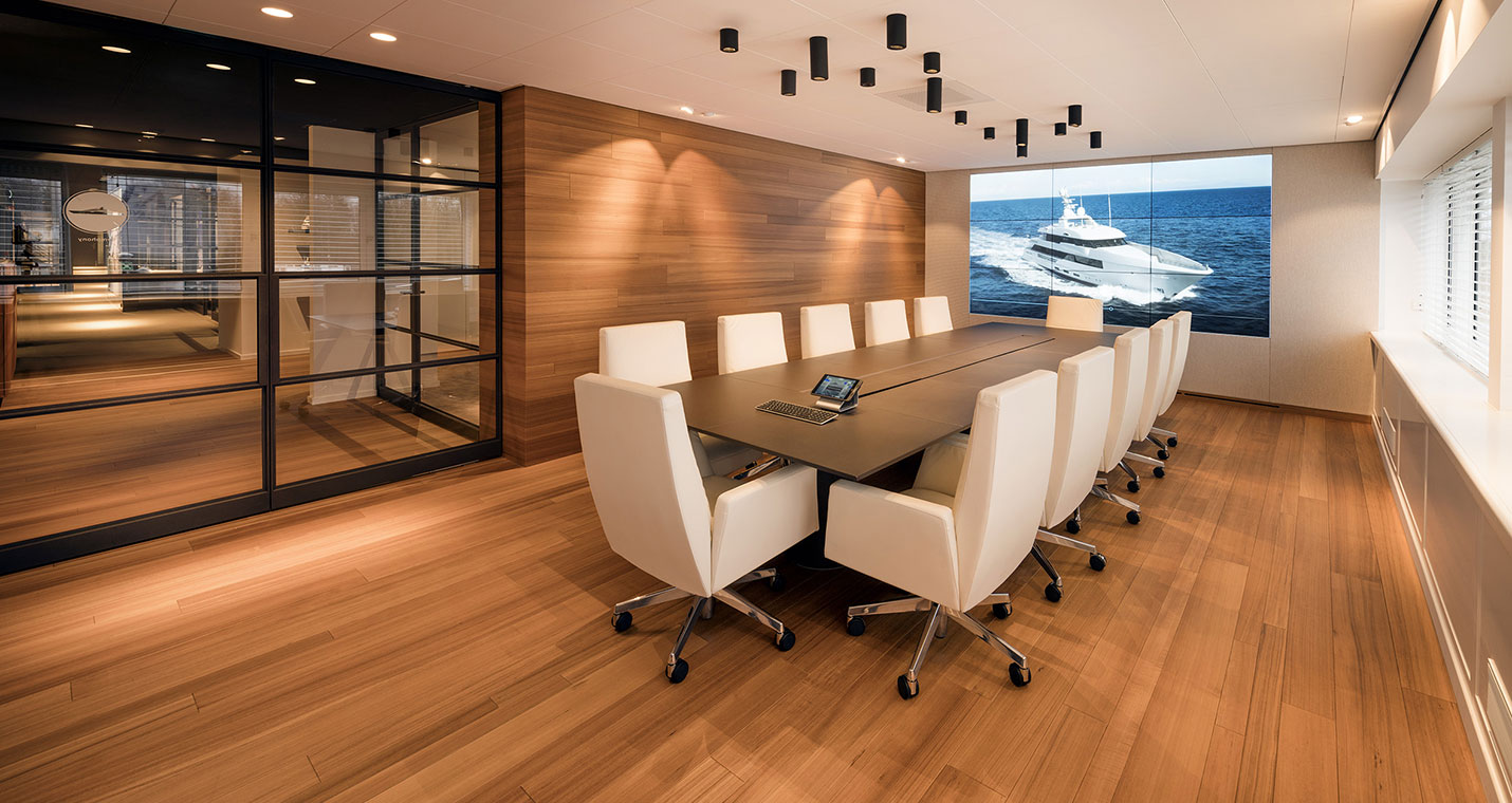 利用長方形桌面的皮面造型,可以規(guī)劃出President Area(總裁區(qū)域):短面使用細木鑲嵌,板材色彩和加工更加豐富鮮明。
