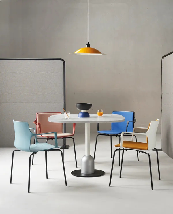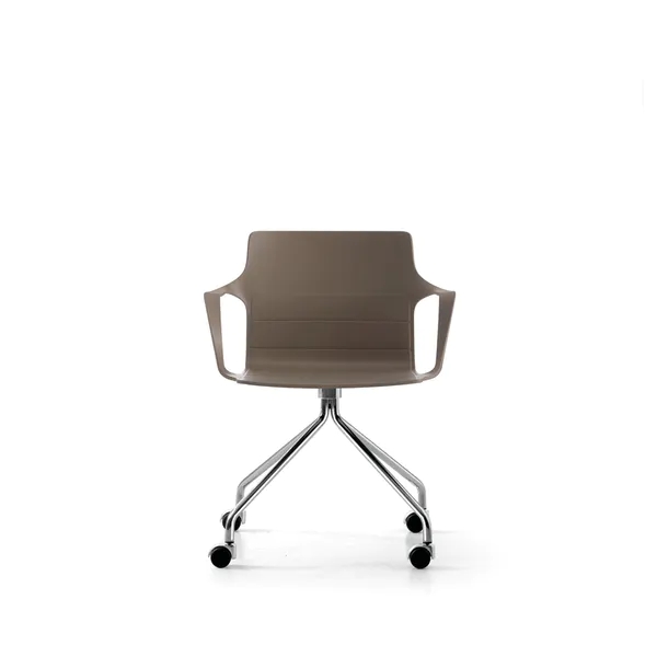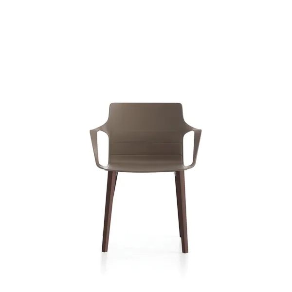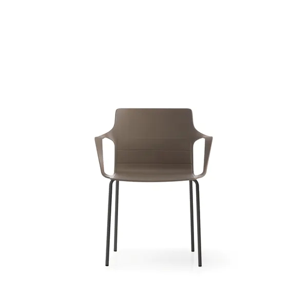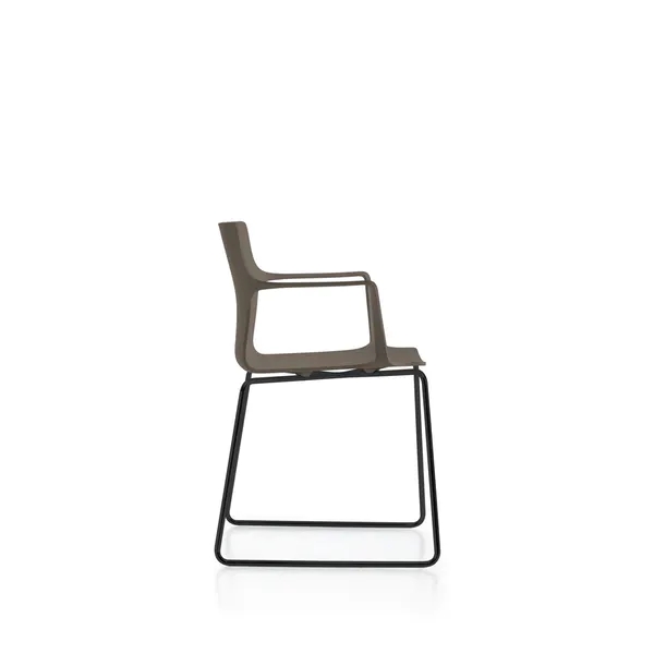 Monoscocca in polipropilene con braccioli integrati. I braccioli sottili e robusti uniscono seduta e schienale realizzando una curva elegante e sinuosa.