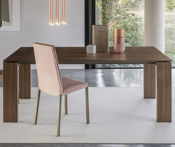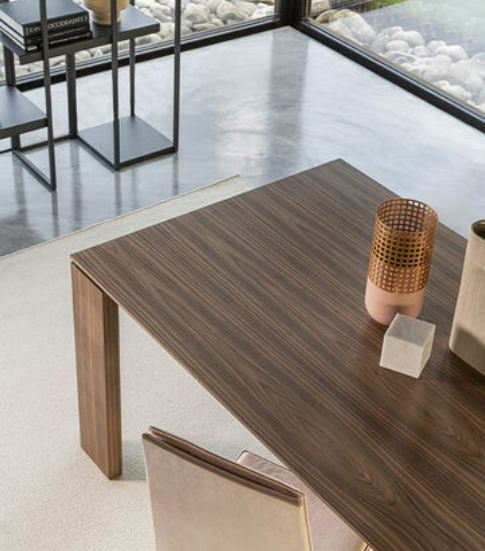 Il tavolo Atlante è interamente in legno, disponibile nelle finiture noce canaletto e rovere coke termo-trattato. Le gambe a cavalletto della larghezza di 17 cm gli conferiscono un aspetto maestoso. La bisellatura del piano mette in risalto le calde venature del legno. Il tavolo è dotato di un sistema di allunghe con guide in alluminio anodizzato. Le allunghe, da 40 cm, sono interne in biglia con il
