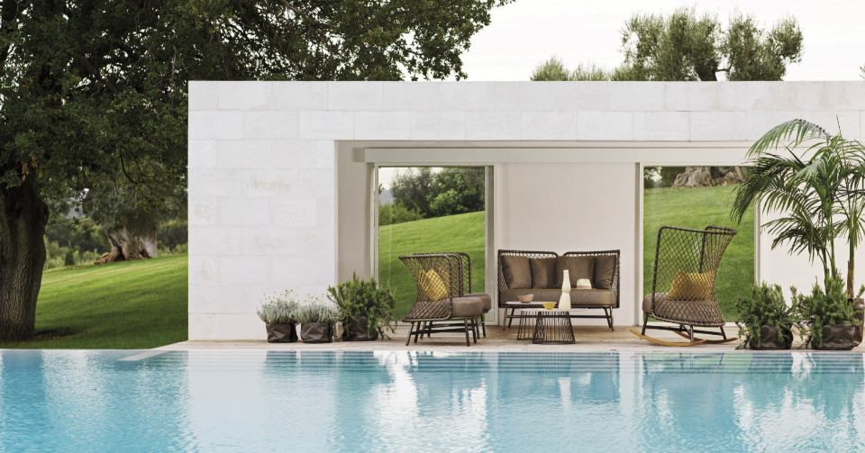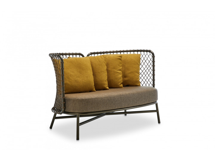 Divano in acciaio 304 verniciato a polveri, intrecciato con Flat Trendyrope. Un divano accogliente, dove la particolare geometria dello schienale si coniuga perfettamente al desiderio di comfort,  creando un angolo per vivere momenti di relax. Ottimo per arredare terrazzi e patio, dona forte personalità anche alle zone living interne. Ideale per arredamenti residenziali e contract.