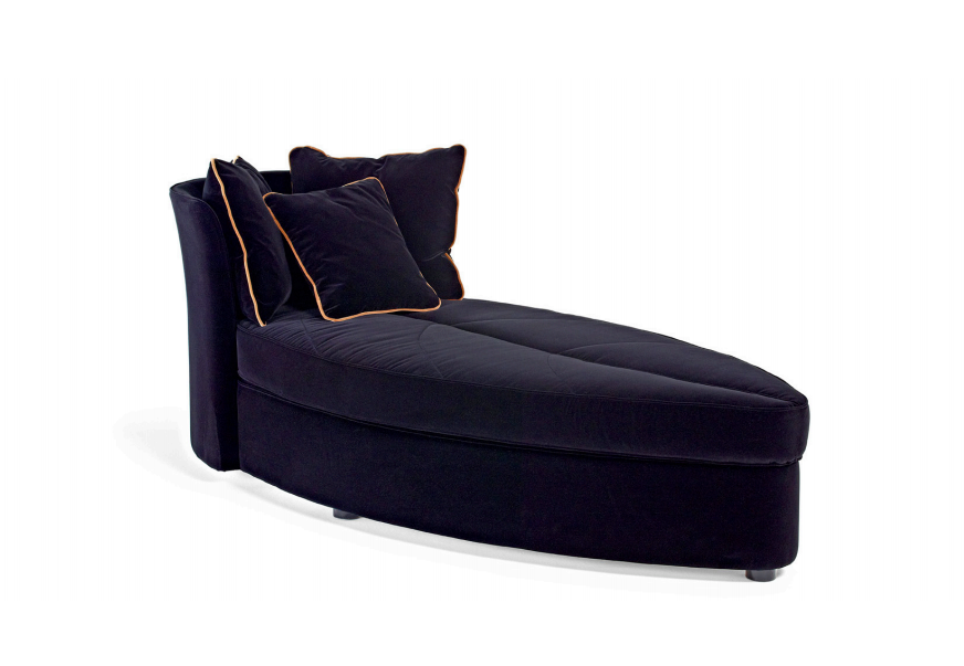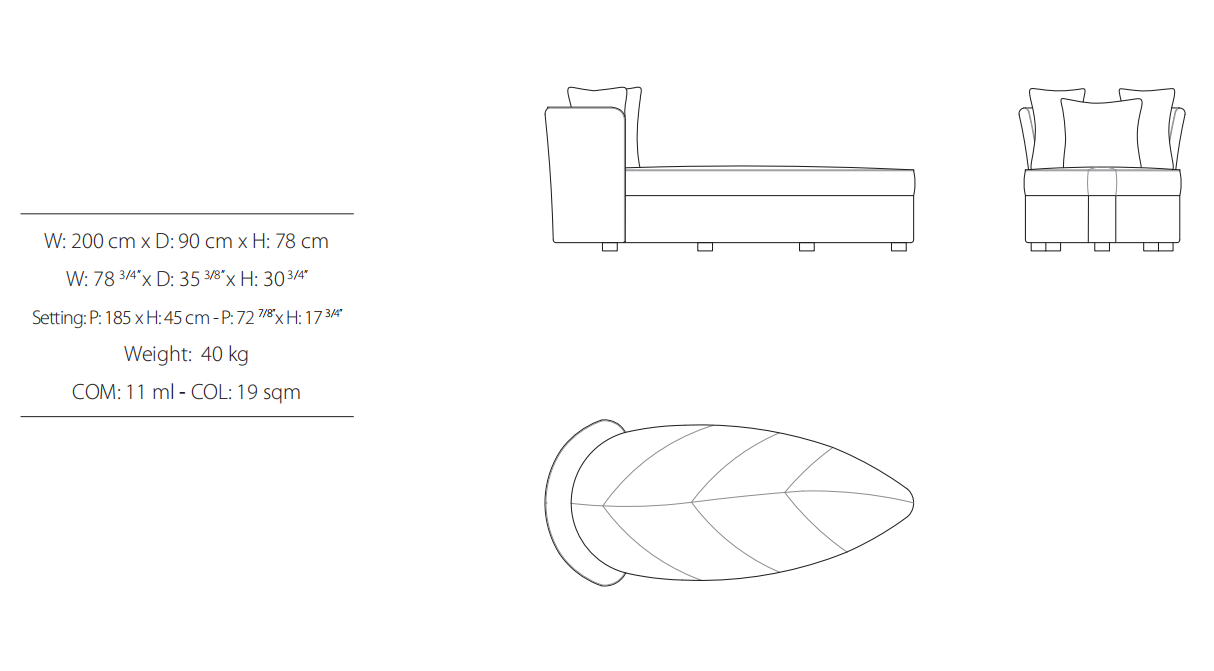Chaise lounge, frame made of solid timber and plywood. Variable densities polyurethane foam padding. Nr. 3 pillows 50x50 cm in mixed feather.