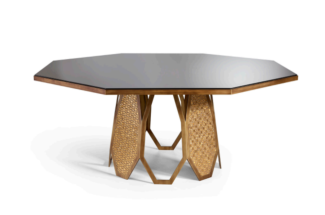 Base and top frame in: polished stainless steel, antique bronze finish, antique silver finish. Top available in mirror, marble and decorative liquid metal finish.  Optional: mosaic inserts on basement.