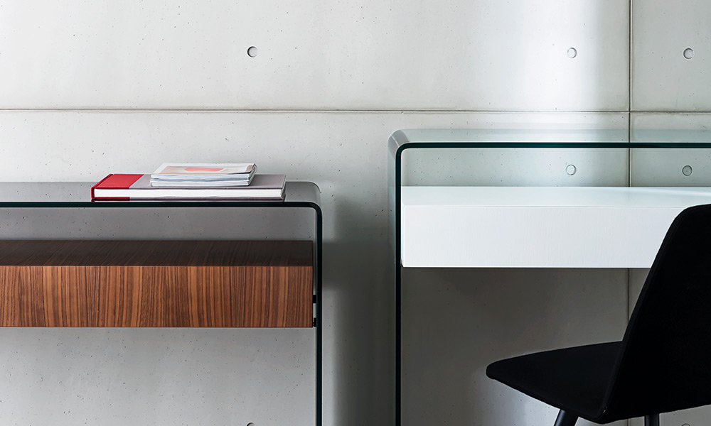 Consolle in vetro curvato trasparente extrachiaro, fumé, laccato, mono o bicolore.