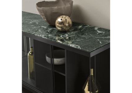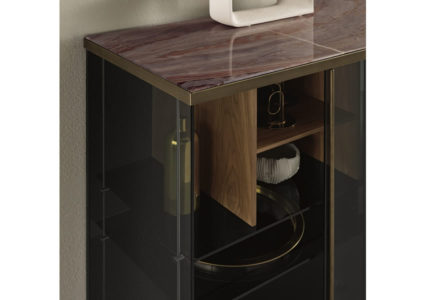 Sideboard in smoked glass available in several heights and widths. Structure with perimeter profile and supporting foot in brushed bronze or brushed black metal. Top in green Guatemala marble or red Arabesque. Optional led lighting on bottom.