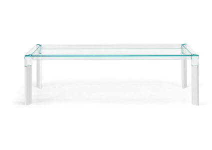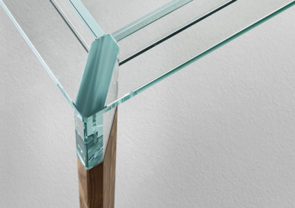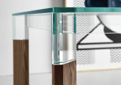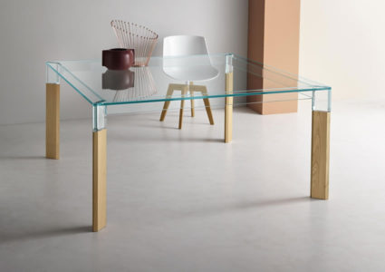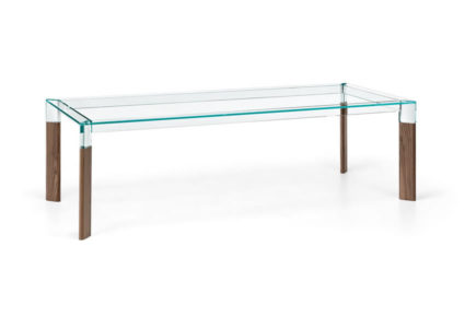 A classical dining table where glass and wood help and enhance each other. The structure’s constructive lines become visible thanks to the crystal’s transparency, while the wood reminds us of architectural memories and supports the product’s qualified versatility within its surroundings.