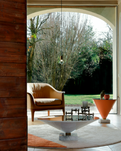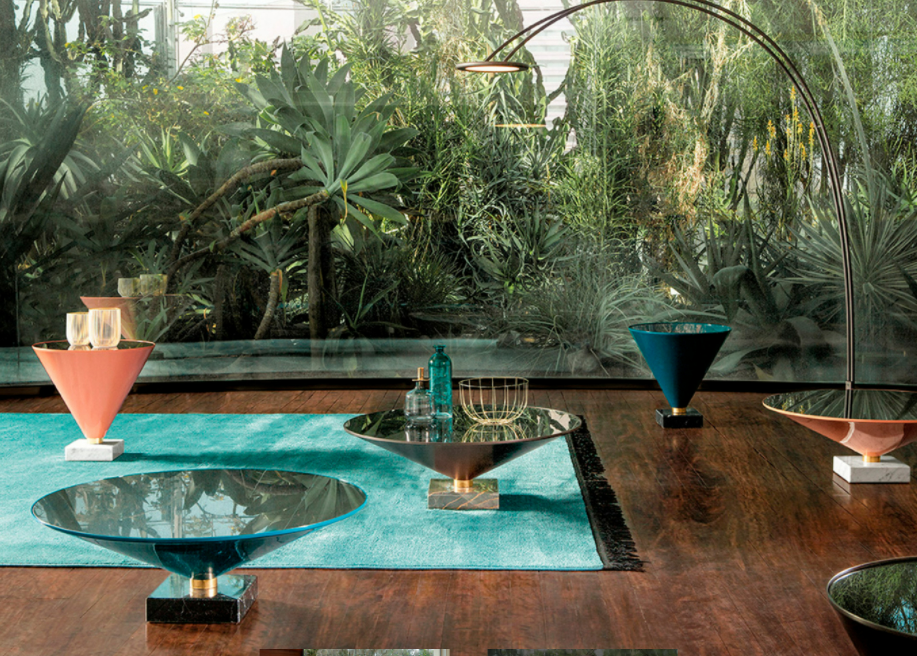 Alto e stretto, per uno spazio che privilegia la verticalità, e basso ed allargato, per un living ampio ed arioso. Flute è ad un tempo una figura che ricorda un elegante bicchiere, e la superficie calma e rilassata di un lago: la base in marmo crea un punto di appoggio solido, che si espande allargandosi nella struttura in metallo, che lieve fa da base ad un top incassato, in vetro fumé trasparente.