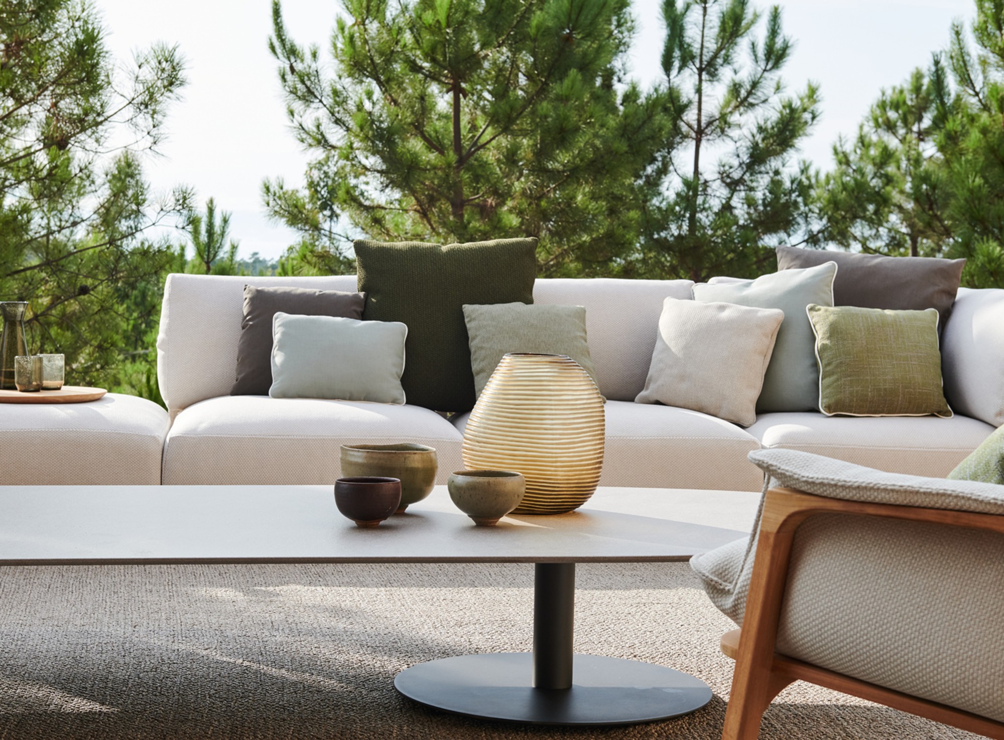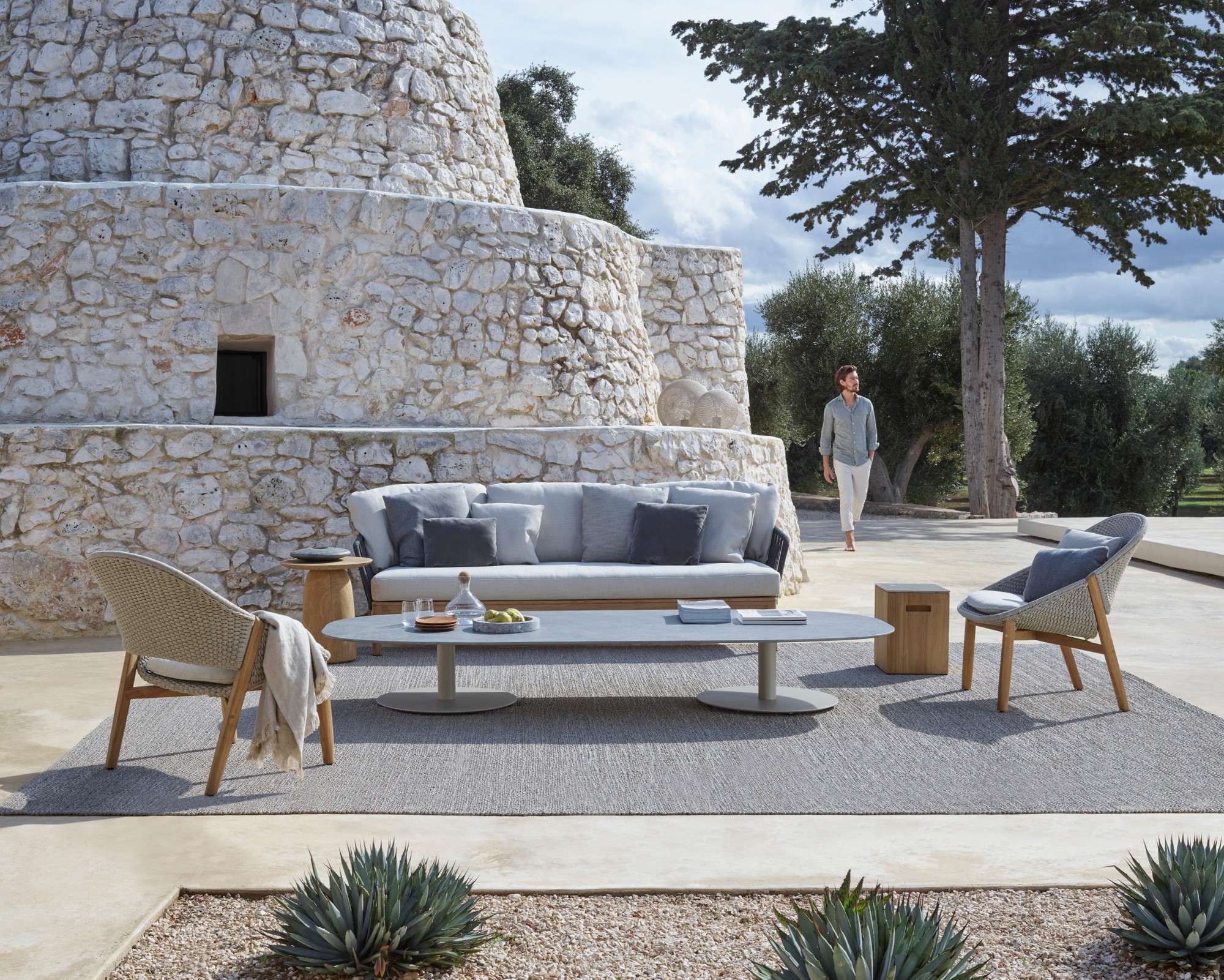 The elegant T-Table with its refined proportions and elegant materials inspires daydreams of a glamorous ‘la dolce vita' existence. The glazed top, made of 400-year old lava stone from the Vesuvius, mirrors the sky and is reminiscent of rippling water. The coloured glazing is added by hand. Baking at a high temperature creates a subtle craquelure finish, giving each table a unique look and making the stone heat, water, UV and stain-resistant, not to mention easy to maintain. This pure and timeless coffee table is available in different diameters and colours and is an elegant addition to your lounge set.