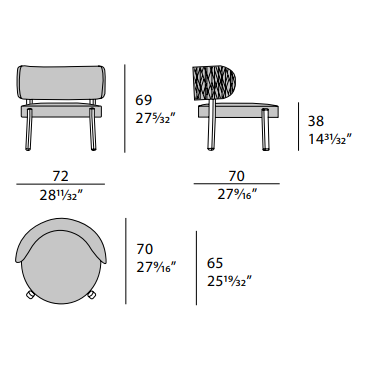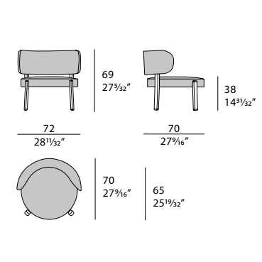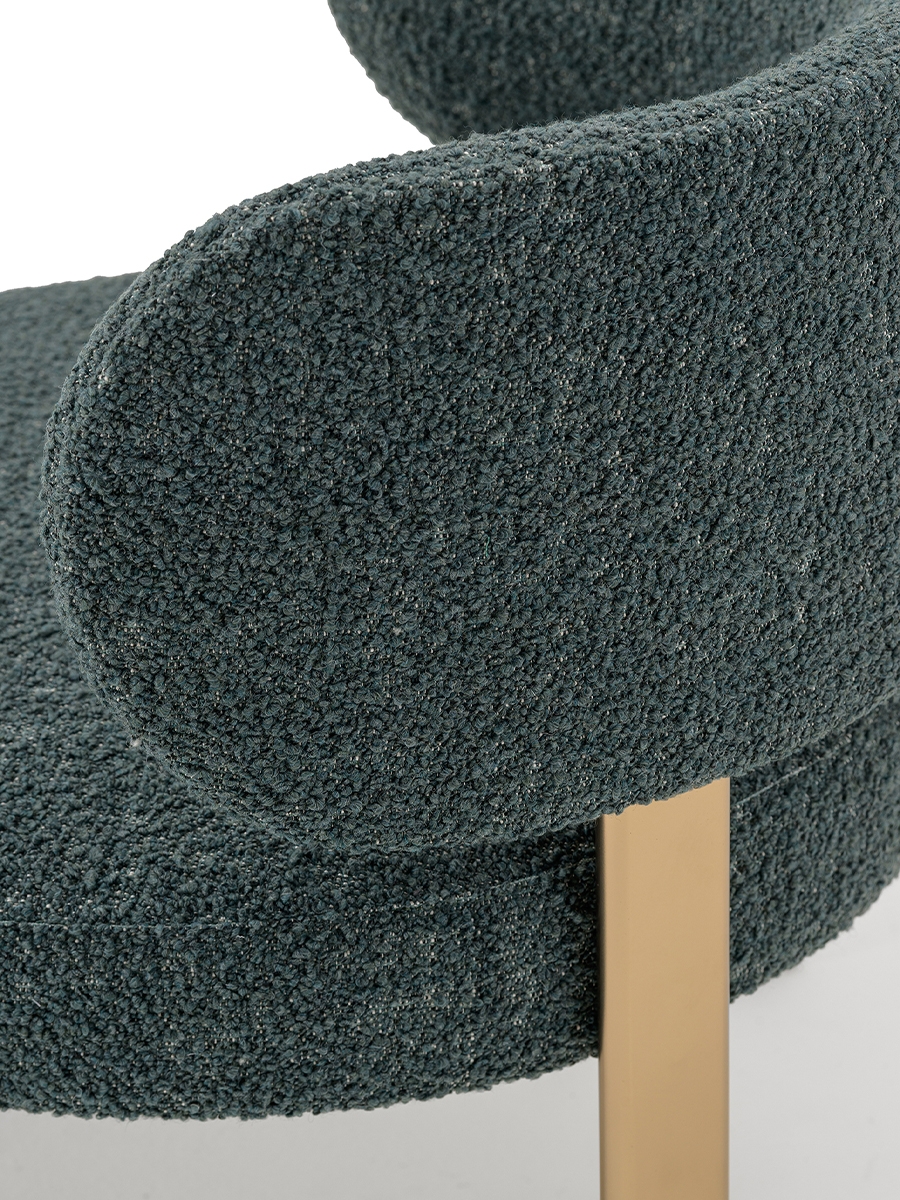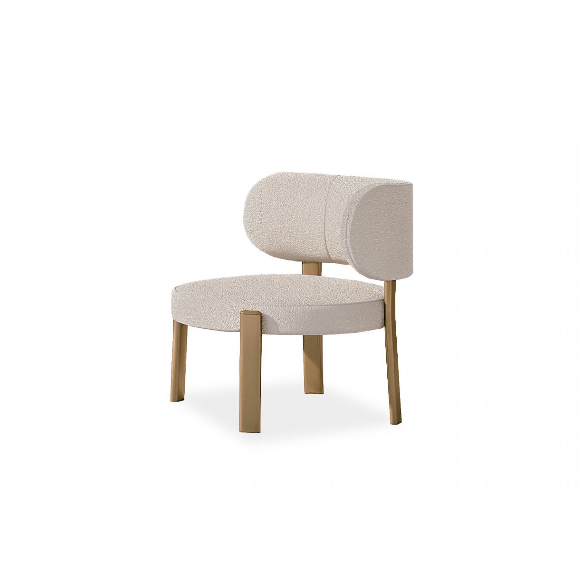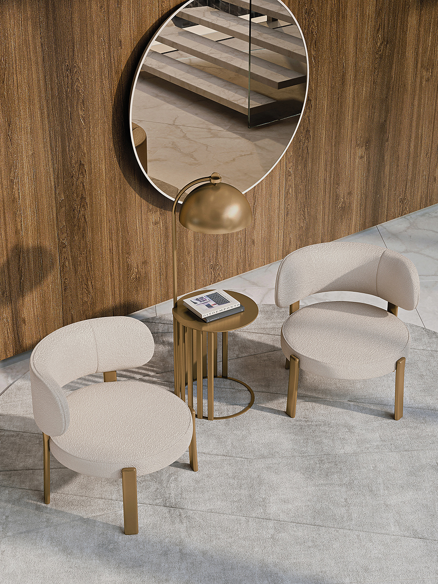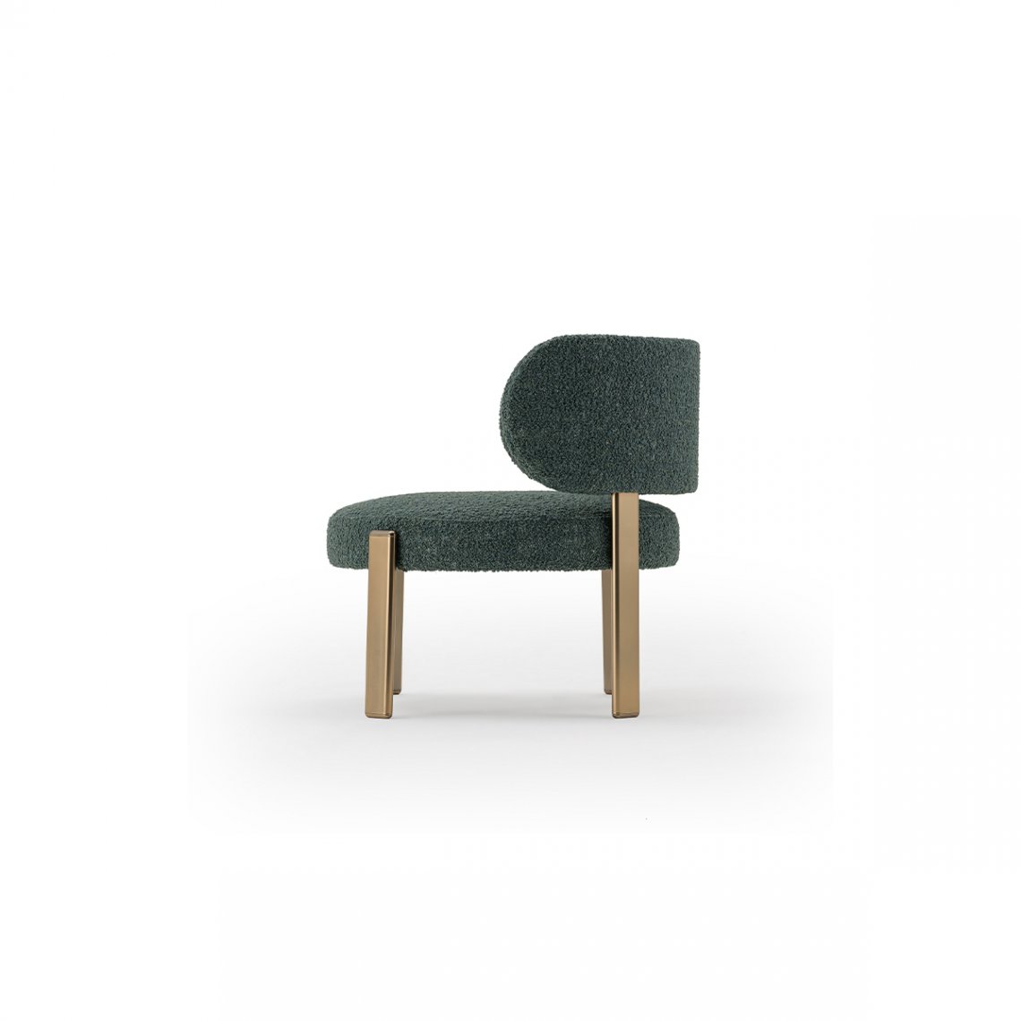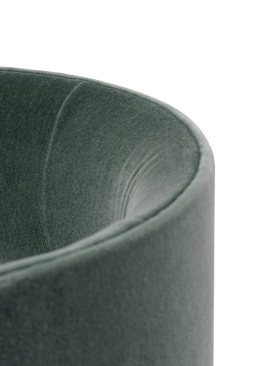 The Roma armchair has a smooth or embroidered backrest and cushions made of fabric or leather. The design references the circular arch, which is also the inspiration for the entire collection, especially the circular shape. The Roma armchair has a variety of finishes to choose from as shown on the sample card.