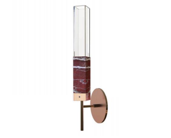 Pendant lamp in marble and steel. Structure in metal with low-relief stripes decoration and central part in solid marble. Prismatic light diffuser in polished polycarbonate with internal satin opaline finish. Wall lamp in marble and steel. Metal structure with lowrelief stripes decoration and central part in solid marble. Prismatic light diffuser in shiny polycarbonate with satin opaline finish. Wall mounting bracket in metal.
