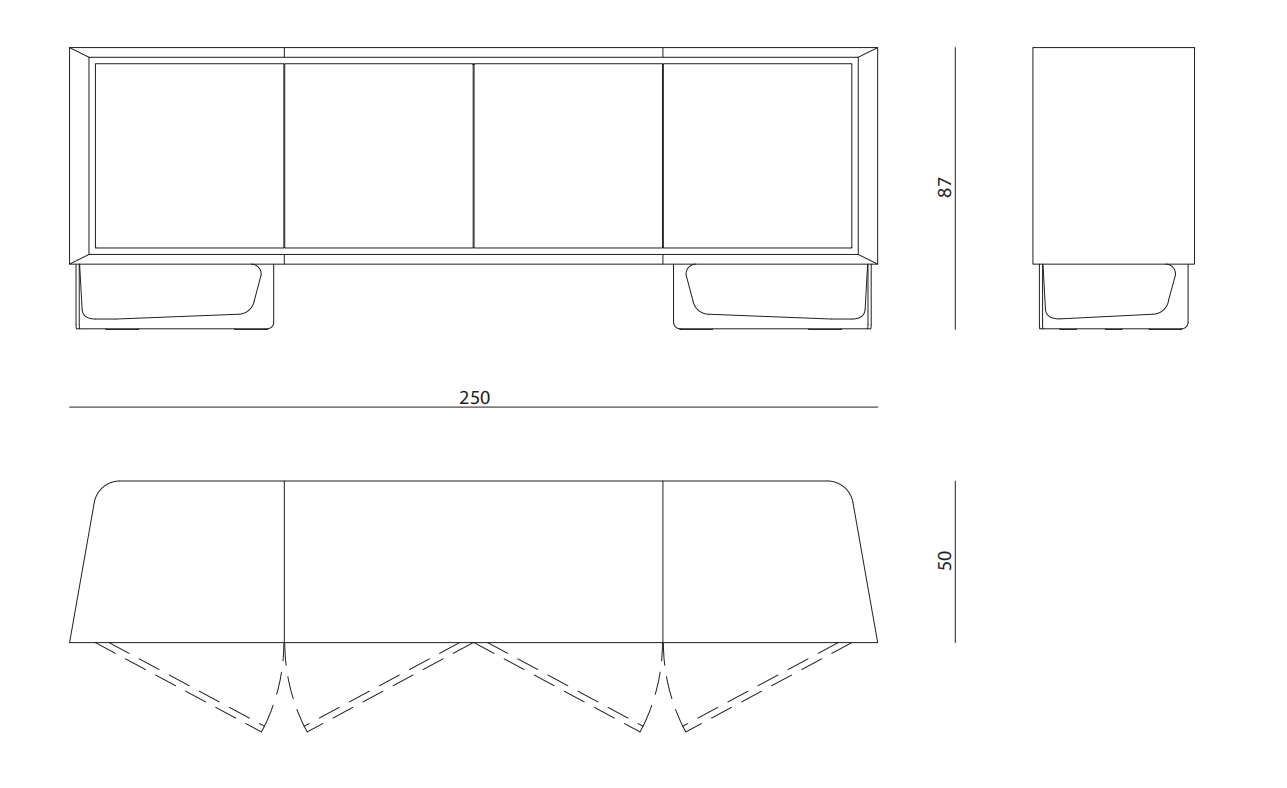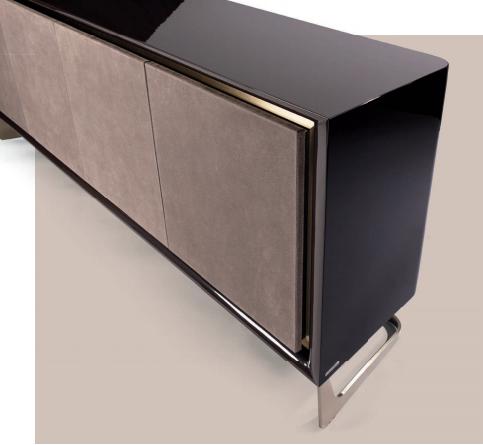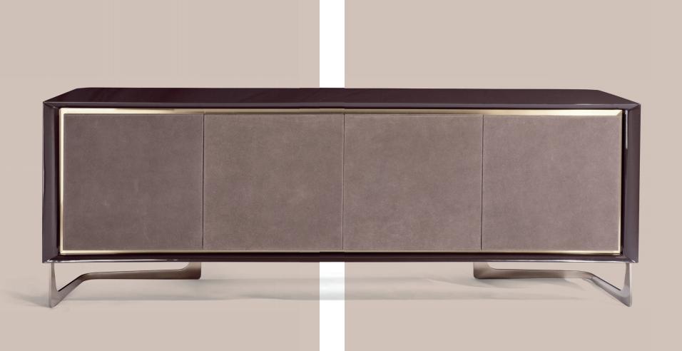 Lacquered structure in plywood with four doors and two internal  drawers, grooves in satinized stainless steel. Doors externally  upholstered in leather or fabric. Legs in satinized metal.