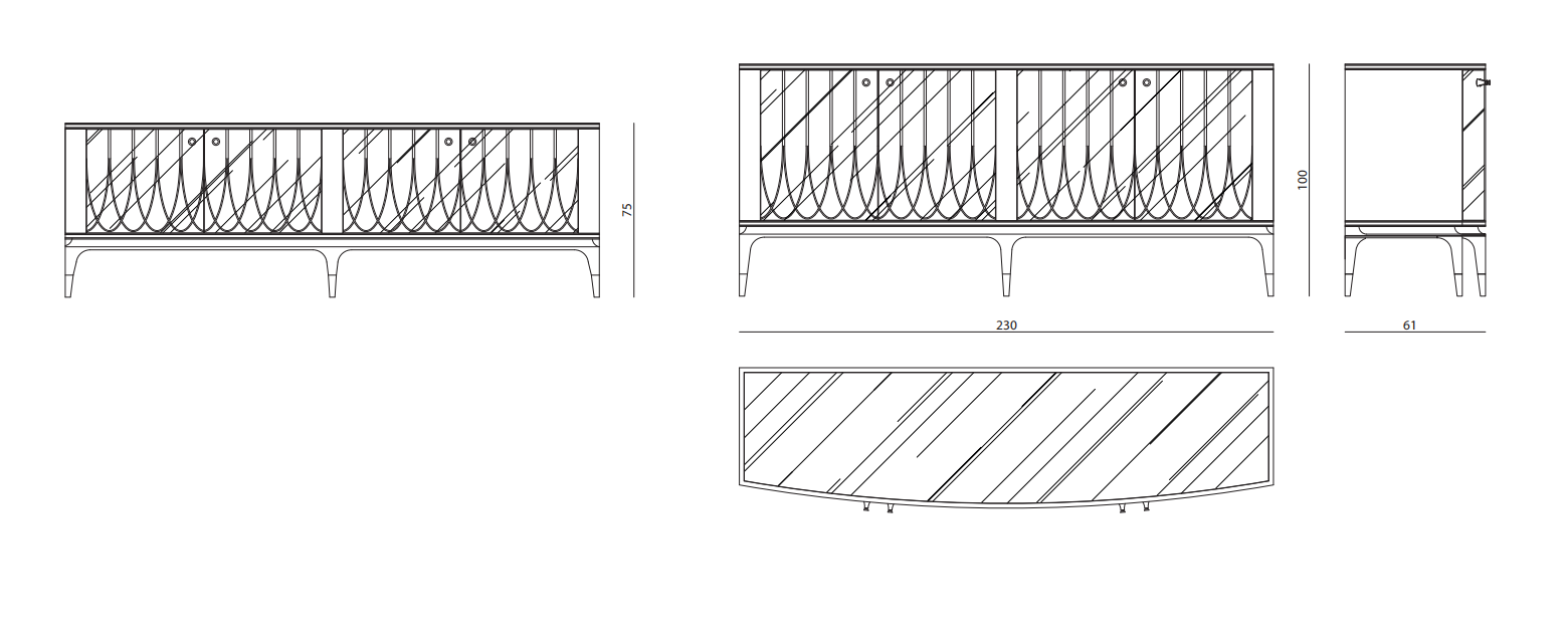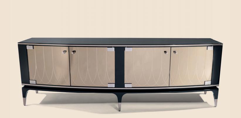 Cabinet in polish lacquered wood, four doors in curved and engraved mirror glass (natural - bronzed - smoked) with handles in aluminium. Top in black or mirrored glass matching the doors. Top profile, base and feet in shiny stainless steel.