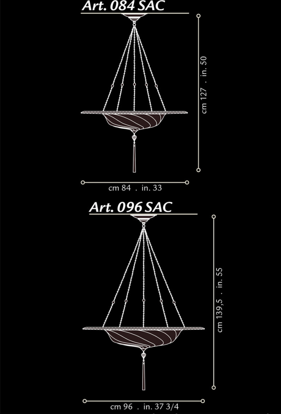 This lamp is ideal for large, sophisticated interiors. The light filters through the silk and penetrates the inlay of the decorative ring to create an evocative atmosphere.
