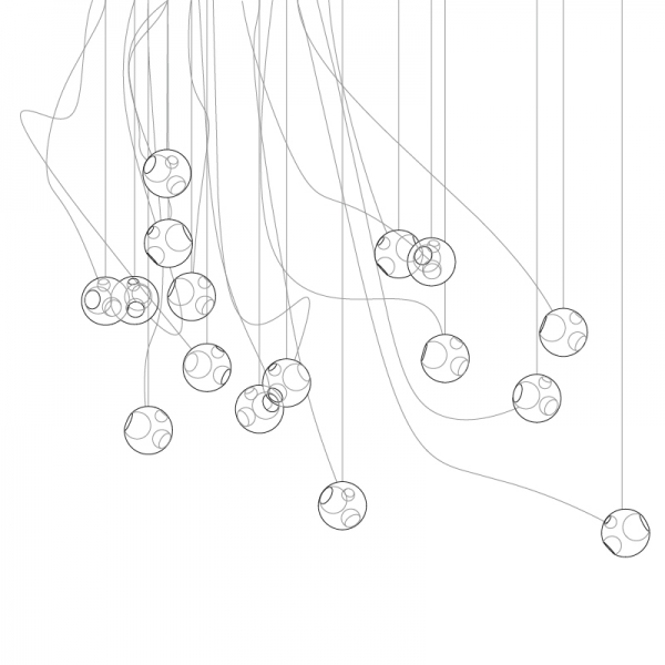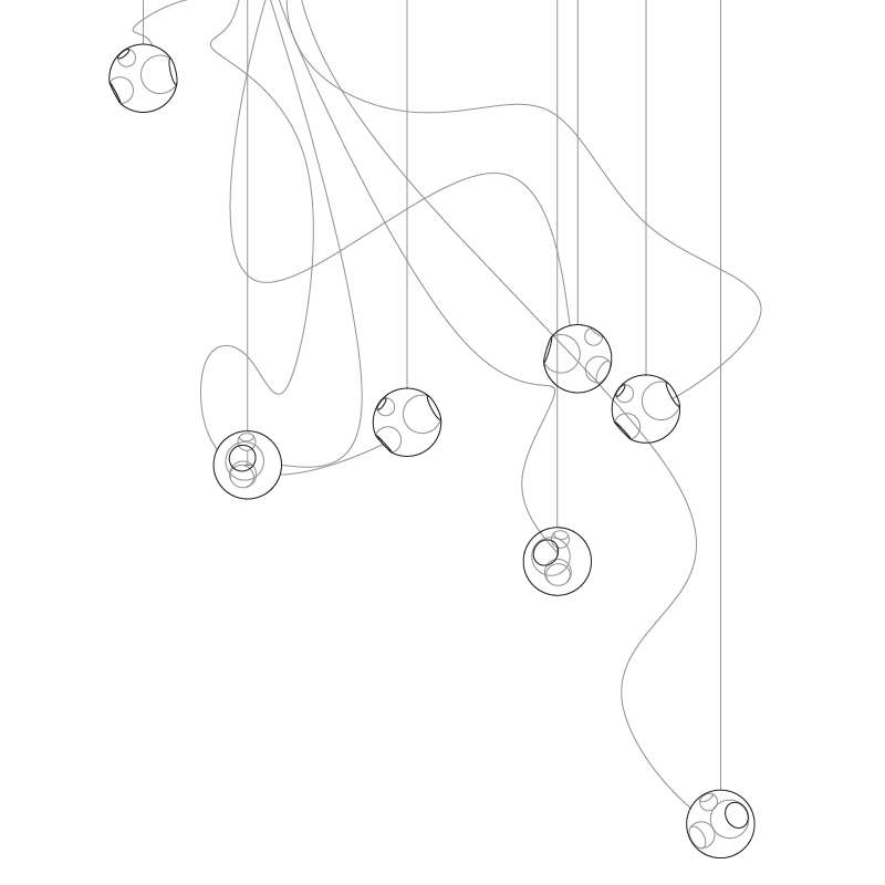 The 28 semi-rigid is a flexible suspension system enables pendants to be nestled in close-knit groups or loosely composed in a wider field, allowing each piece to be perceived individually.