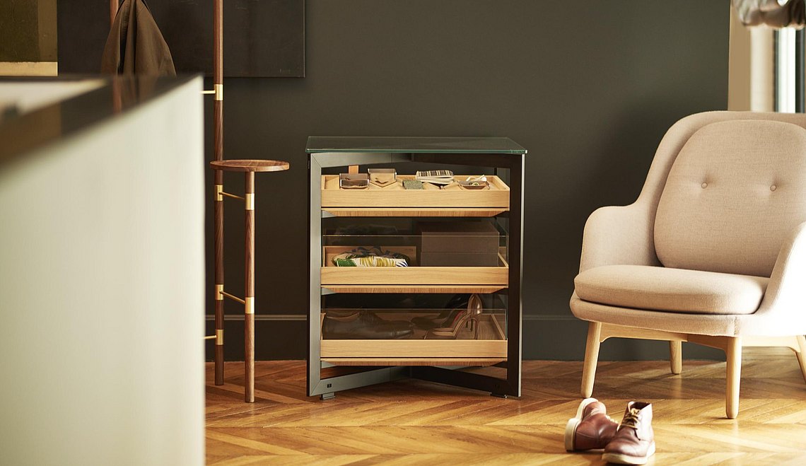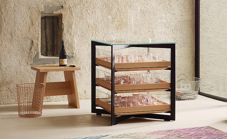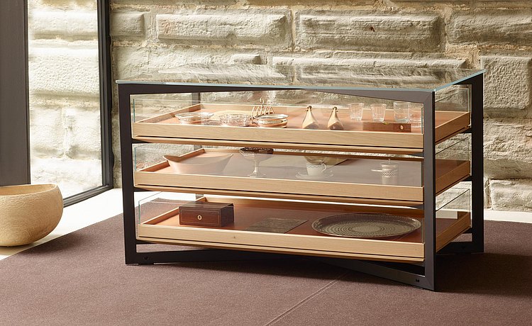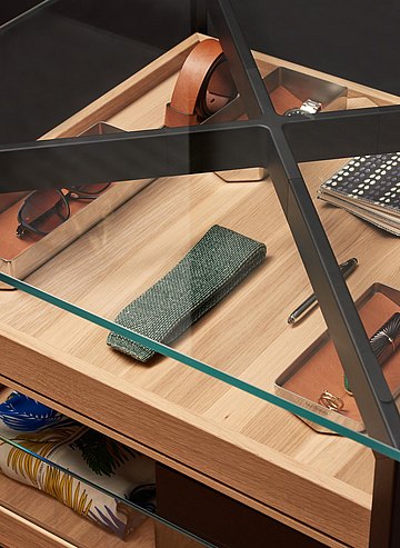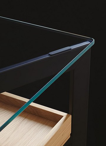 Glass displays without concealing anything. Glass protects without giving anything away. The combination of superb transparency and robust elegance makes glass a valuable element of your bulthaup b Solitaire. The glass top layer – with its precision-milled radius in the edge area – gives a clear view of collected treasures or everyday essentials.