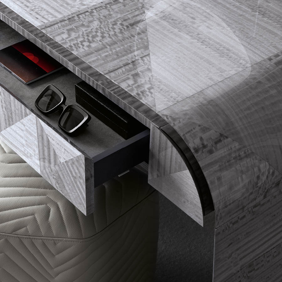 Curved vanity desk in inlaid Tasmanian curly Eucaliptus veneer with high gloss polyester finish. Curved legs with details in satin grey nickel stainless steel. 1 external full extension drawers with bottom part in velvet fabric.