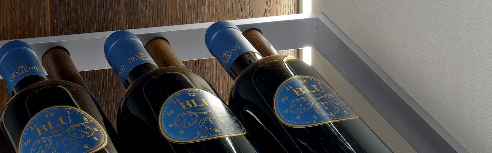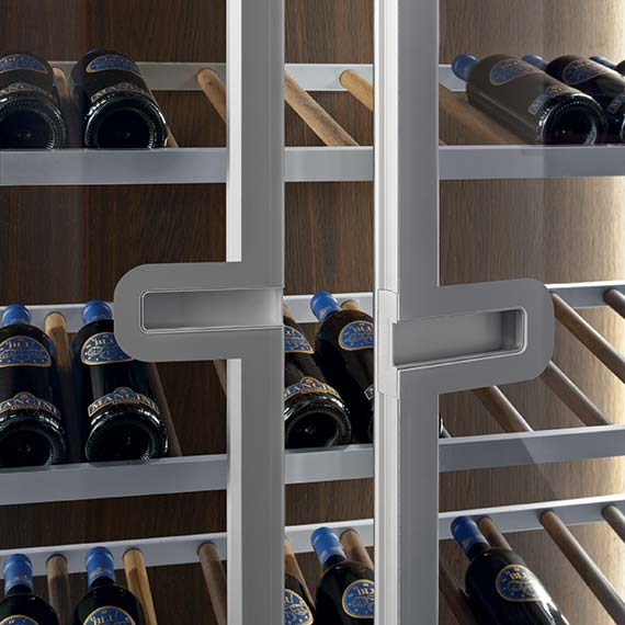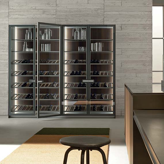 這種玻璃展示柜設(shè)計用于存放瓶裝葡萄酒。 定制而成的內(nèi)飾格外豐富,盡顯別致,將廚房與生活區(qū)融為一體。葡萄酒存儲柜 Air Tab sp. 2.8 厘米,透明灰色玻璃背膠單板碳化橡木