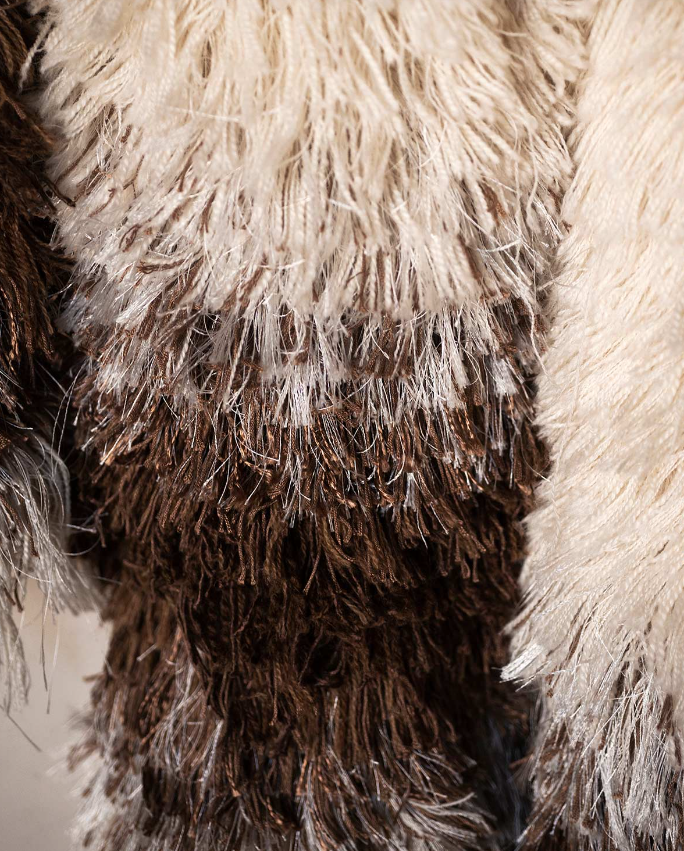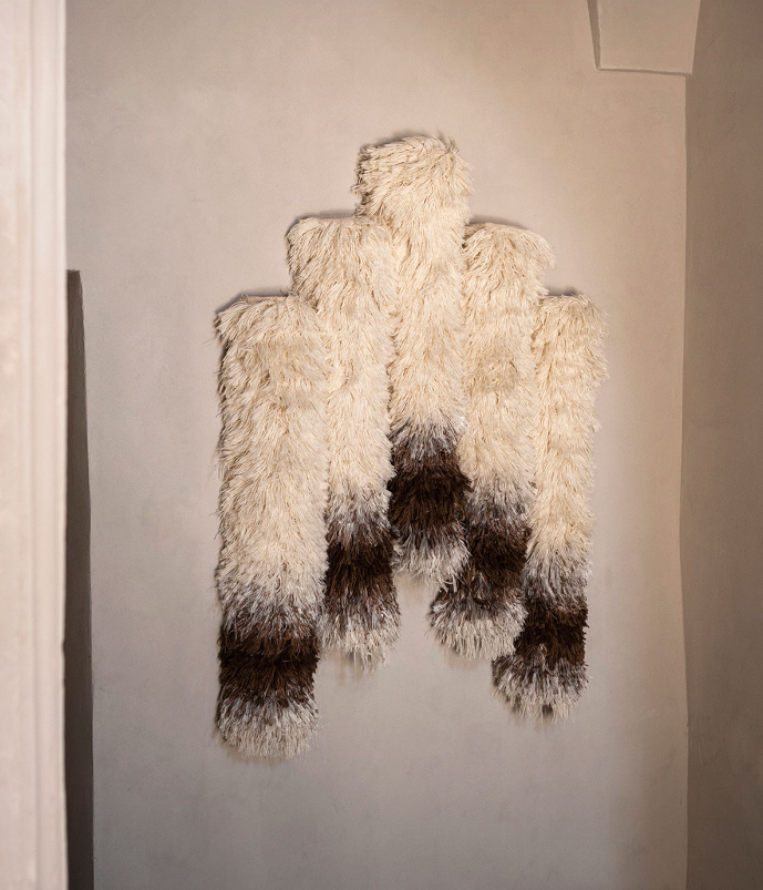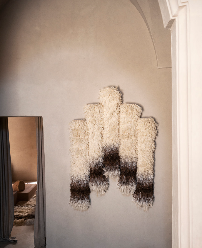 In German, “l(fā)eise” means silent. Inspired by the warmth and quiet that tapestries have given to interior spaces for centuries, Salem van der Swaagh created a wall hanging for Tacchini that fuses tactile and visual sensations in a textile work that invites slow, silent exploration. Leise takes shape from a meticulous manual knotting technique that defines its volume and texture – from the rich white tones to the ends that seem almost immersed in gold – in a tonal and material transformation that creates a rich and harmonious contrast. An invitation to slow and silent exploration to grasp the poetics of tactile sensations in a continuous balance between wild and tamed, raw and worked.