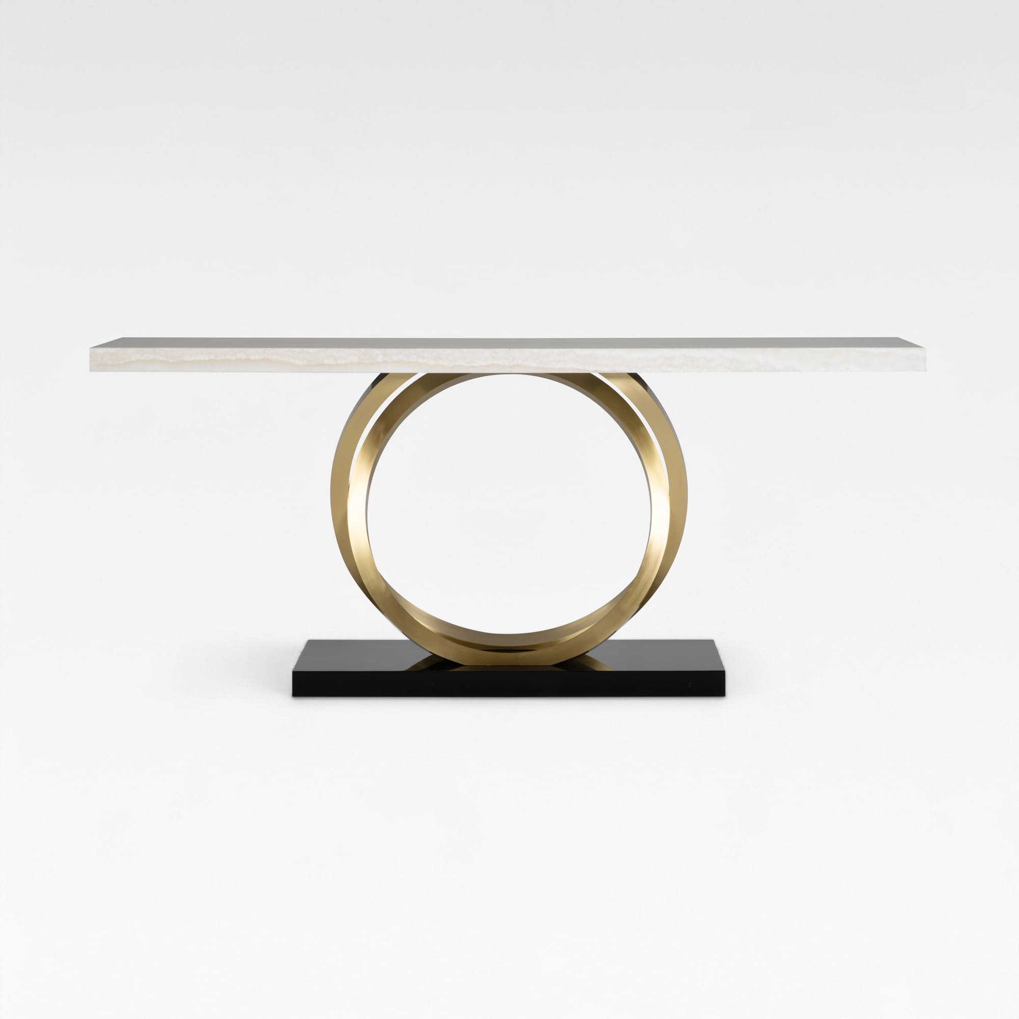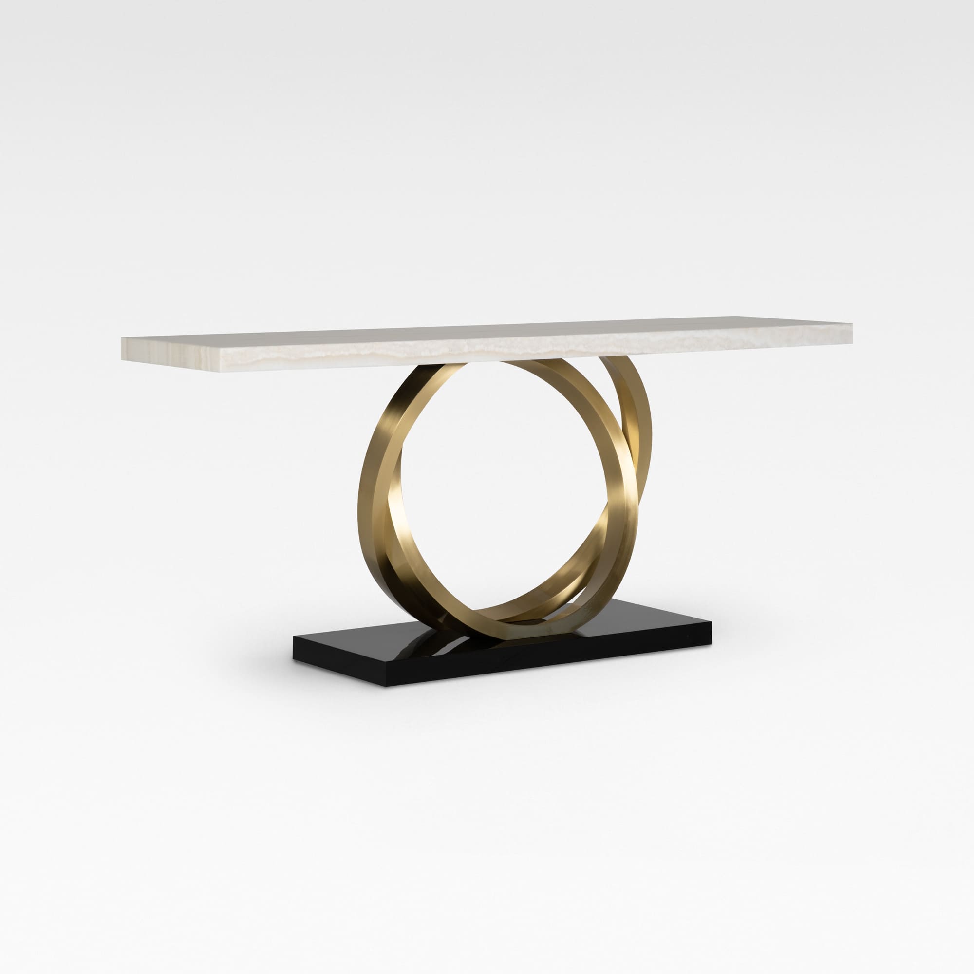 The Armilar stone console table is a modern tribute to the Portuguese armillary sphere, a navigational instrument that guided explorers across uncharted seas. Featuring two intersecting rings that elegantly support its stone top, this sculptural piece embodies a sense of movement and discovery. Designed to stand out, the Armilar stone console table brings a bold yet refined presence to modern interiors.