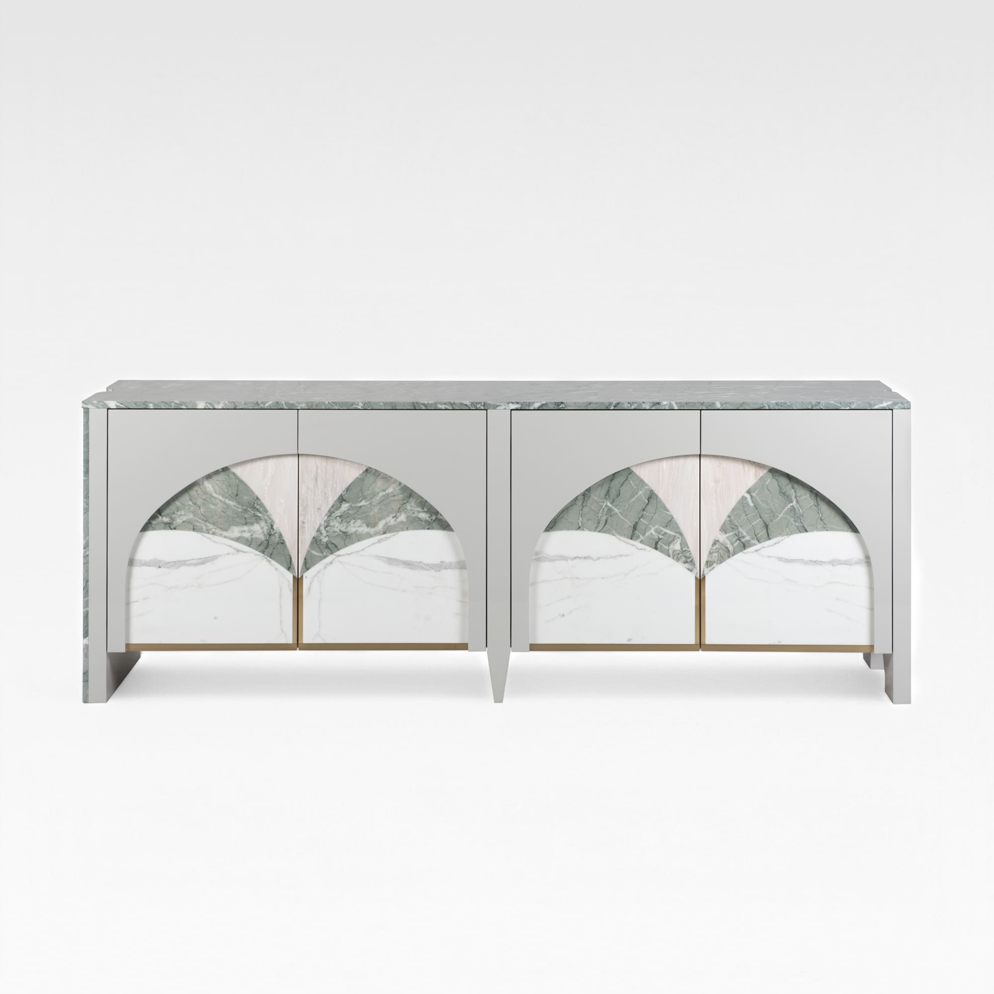 The Biloba marble bar cabinet celebrates Portuguese architectural heritage and organic design, resulting in a creation rich in history and artistry. Drawing inspiration from the Alcoba?a Monastery, its Gothic and Baroque influences are reimagined through signature arches, meticulously crafted from three distinct marbles to form the delicate patterns of Gingko Biloba leaves. With a thoughtful balance of tradition and contemporary design, the Biloba marble bar cabinet stands as a timeless, heirloom-quality furniture piece.