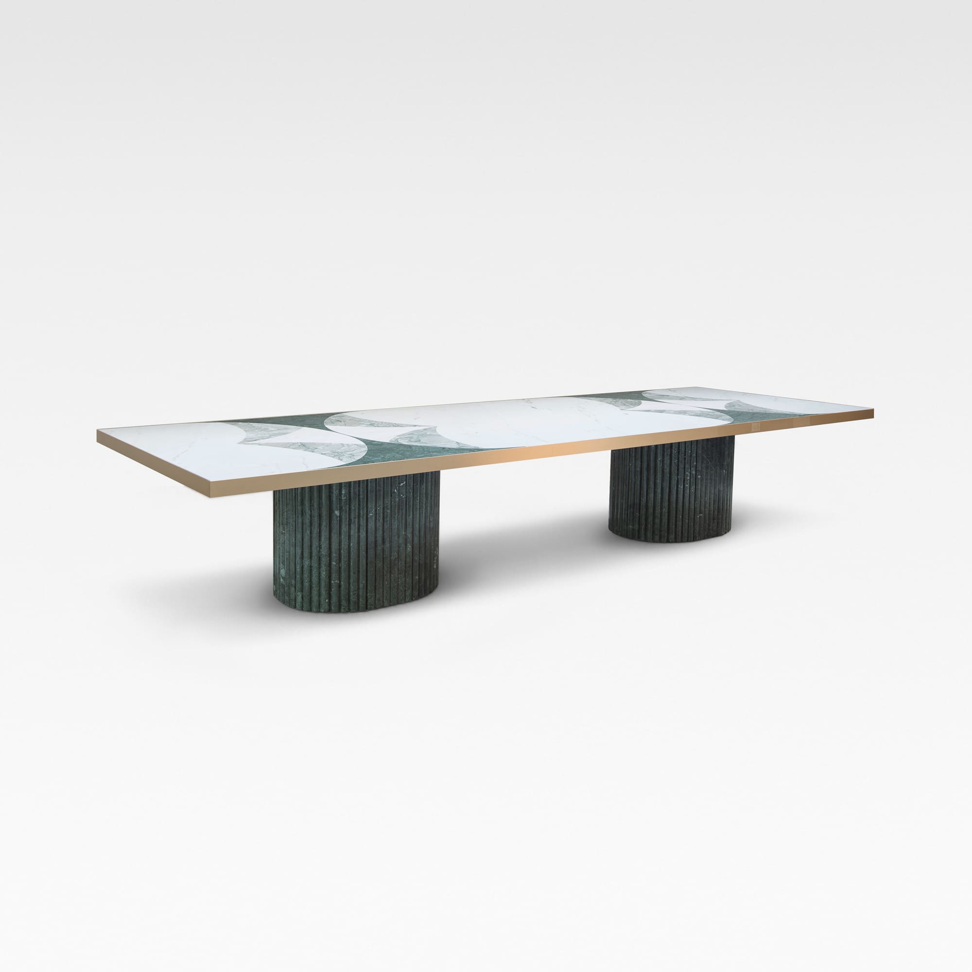 The Biloba marble dining table celebrates Portuguese architectural heritage and organic design, resulting in a creation rich in history and artistry. Drawing inspiration from the Alcoba?a Monastery, its Gothic and Baroque influences are reimagined through signature arches, meticulously crafted from three distinct marbles to form the delicate patterns of Gingko Biloba leaves. With a thoughtful balance of tradition and contemporary design, the Biloba marble dinng table stands as a timeless, heirloom-quality furniture piece.