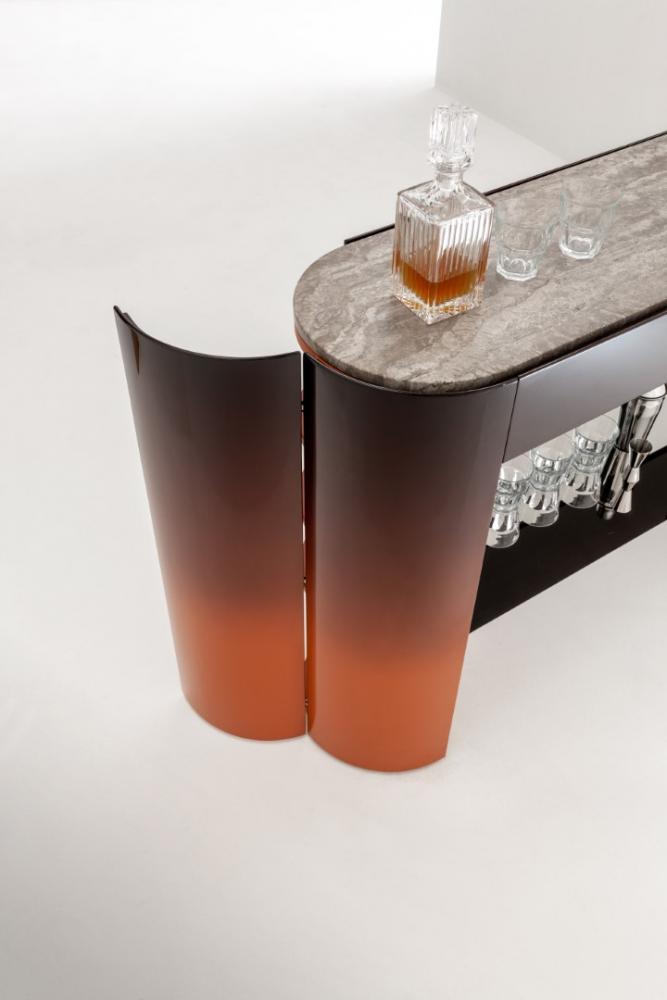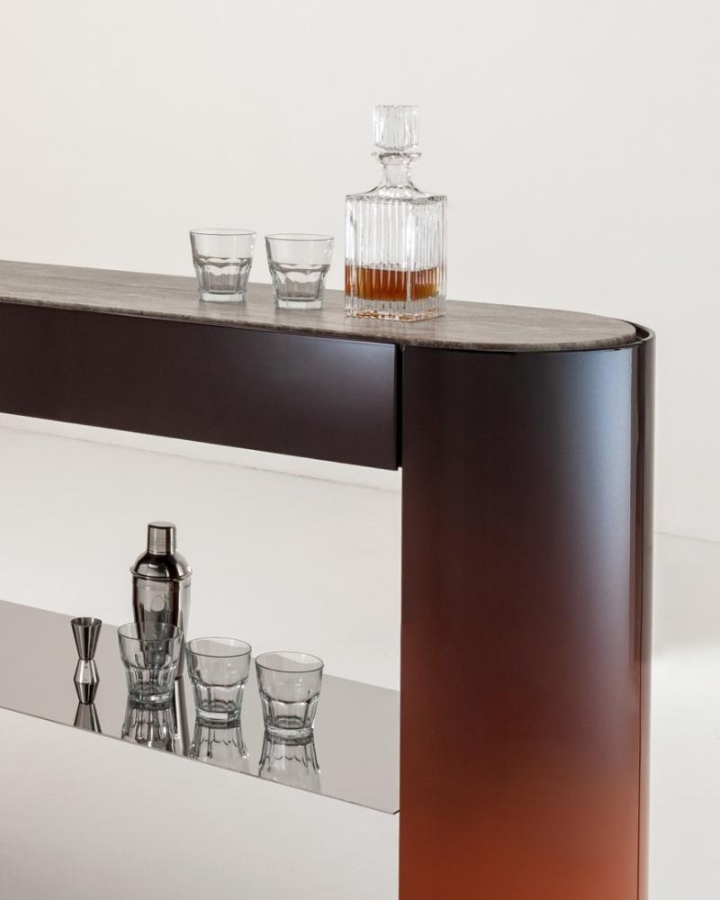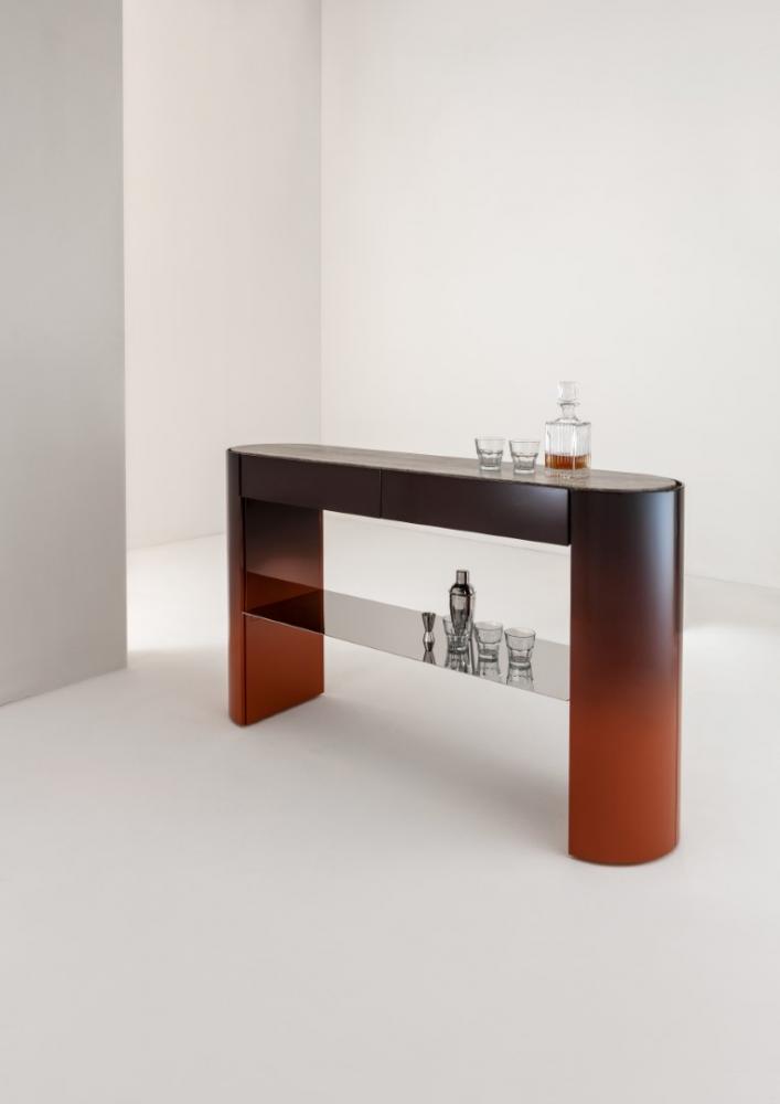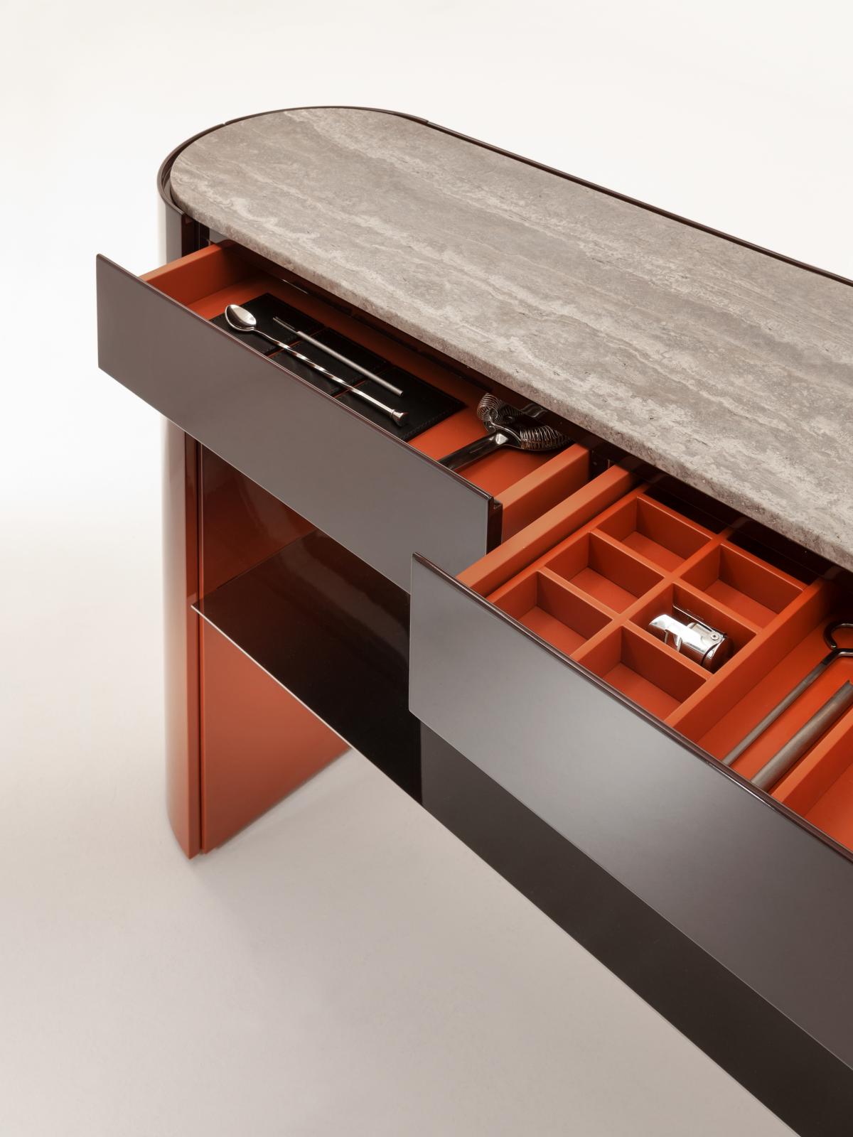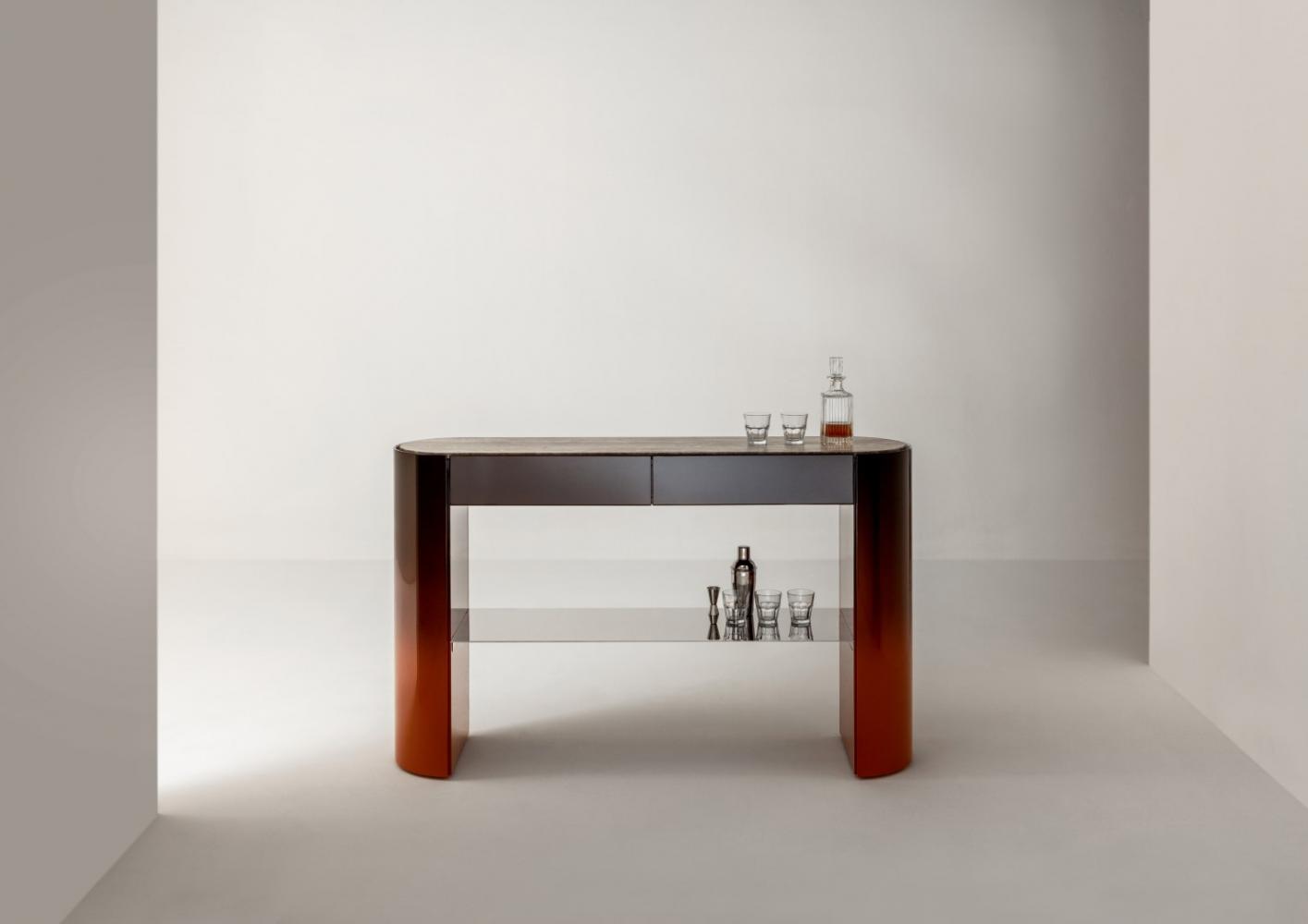 Console with curved sides, marble top, and polished steel under-top. Equipped with storage compartments with integrated hinged doors in the legs and featuring two drawers.